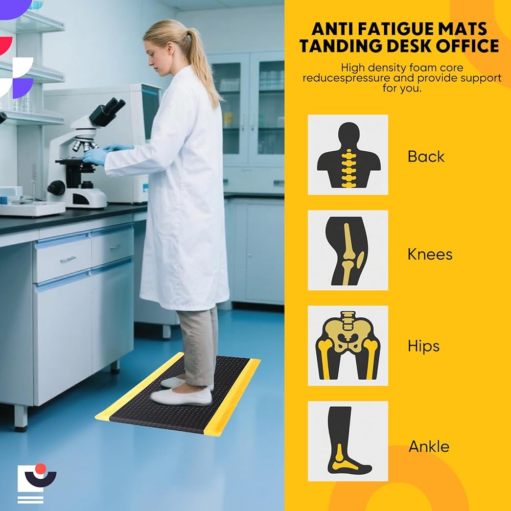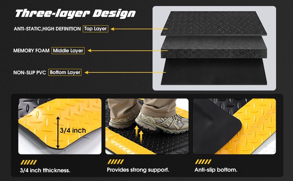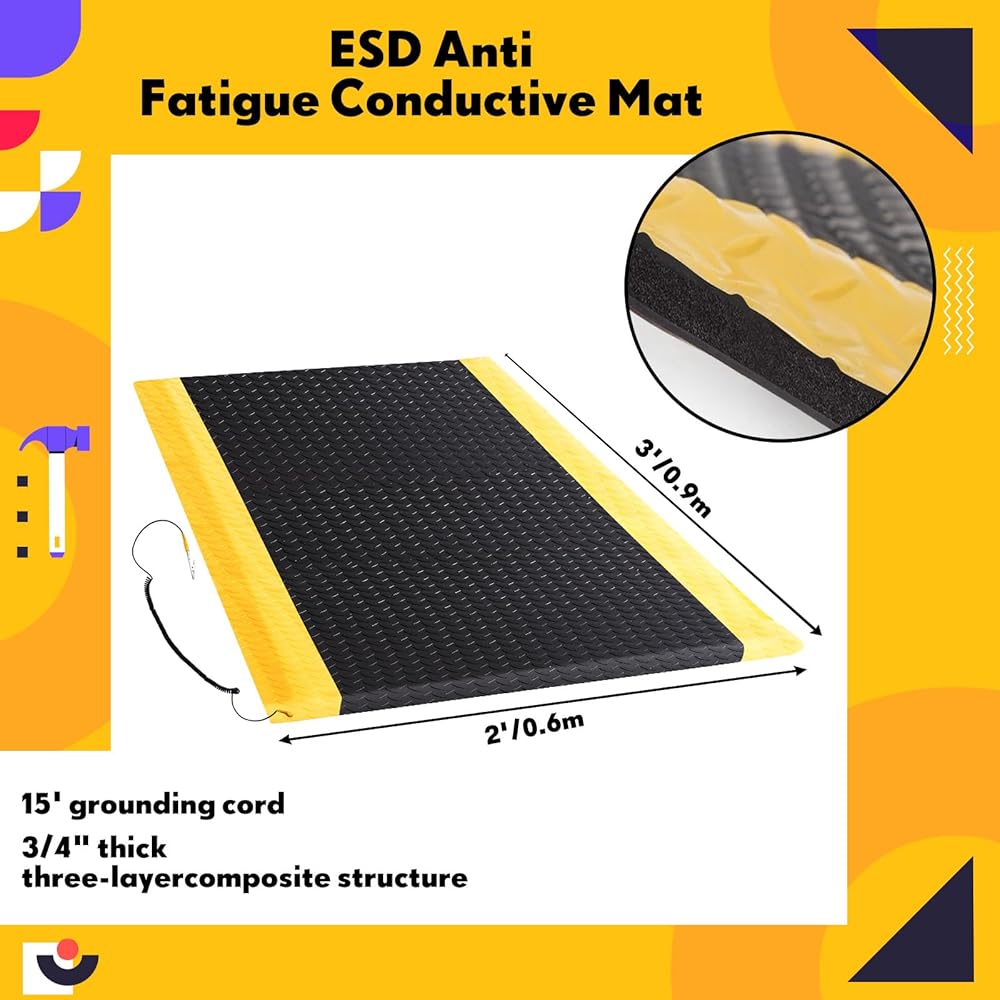 Anti Fatigue and Anti Static Mat: this anti-fatigue mat is constructed from 3/4" high-density memory foam for optimal cushioning support; Compared to standard polyurethane foam mats, its ergonomic design reduces stress on feet, knees, and lower back during prolonged standing, surface resistance: 105-106 Ohms; Simultaneously dissipates static charges to protect sensitive electronic equipment and prevent electrical shock hazards