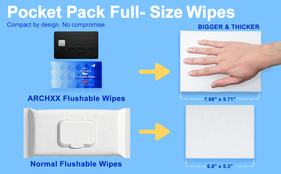 7 FOR LUCK — 16 travel packs with 7 unscented flushable wipes each, total 112, give you more wipes and more packs for every day of the week. Each wipe measures about 7.7 x 5.7 in, larger than typical mini wipes for a more effective clean. Mens wipes flushable bring luck every day. Travel butt wipes make clean‑ups easy. Travel size wipes fit in your pocket. Questions about travel wipes flushable? Contact us on Amazon.