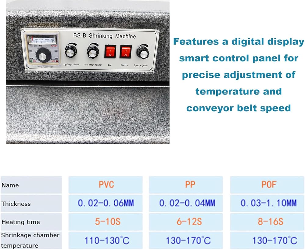 [Smart Temperature Control & Control Panel]: Features a digital display smart control panel for precise adjustment of temperature (PVC film: 110-130°C / 240-266°F; POF film: 120-180°C / 248-372°F) and conveyor belt speed (0-10 m/min / approx. 0-32.8 ft/min). Intuitive operation with LED indicators supports stepless variable-speed temperature control.