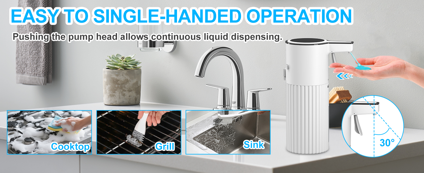 【Touch-Activated Dispenser】This hand soap dispenser features touch-activated technology that automatically stops dispensing when your hand is removed, allowing precise control over the amount of soap released. Perfect for one-handed operation, it enables continuous flow with a long press on the pump head, making it an excellent helpe for cleaning large items.