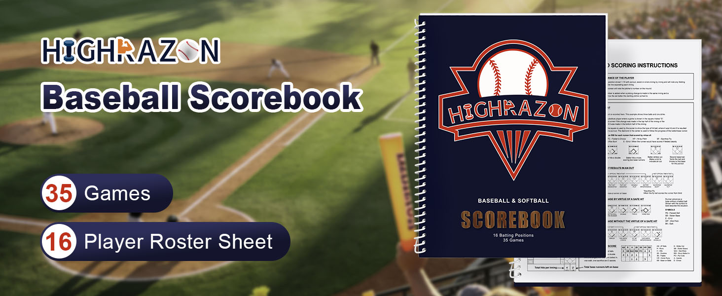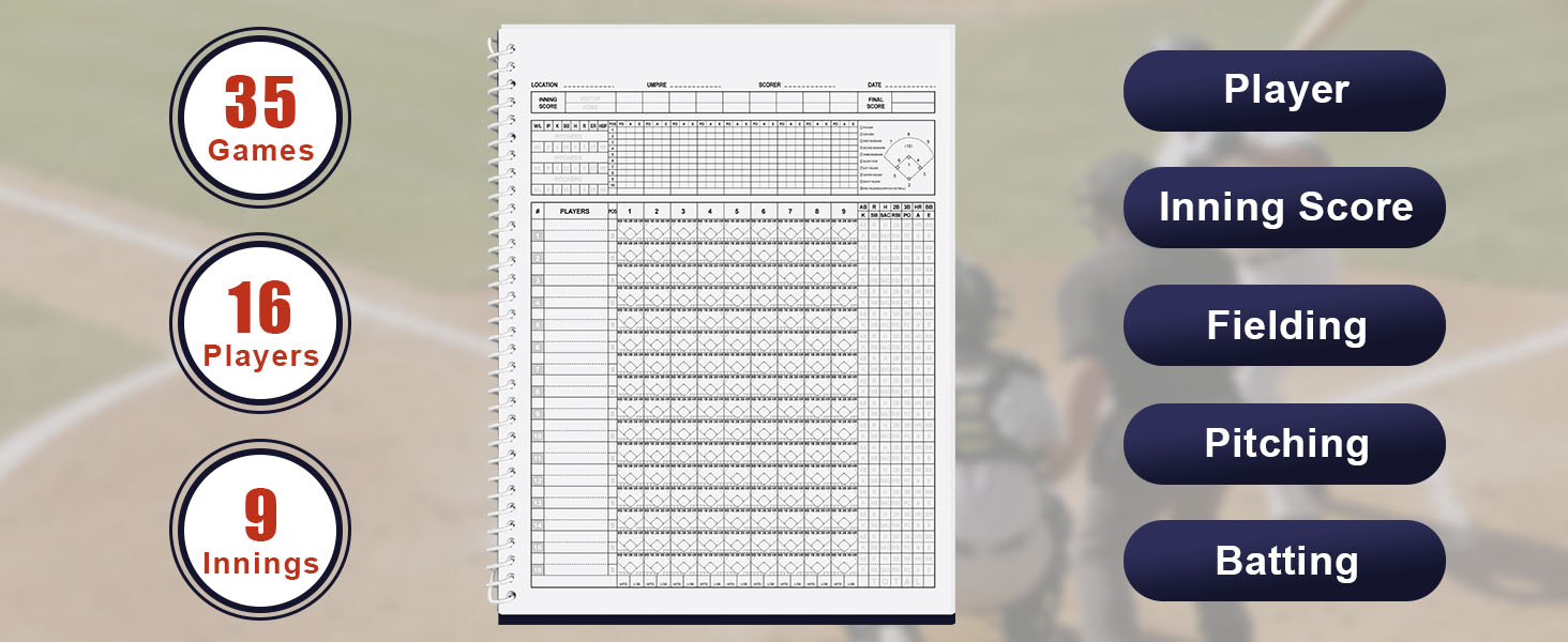 • 35 GAMES SCOREBOOK: Our baseball scorebook includes a scoring table for 35 games where you can recoring both home and away. It provides you with well-organized statistical data throughout the entire season. And, comes with stickers!
