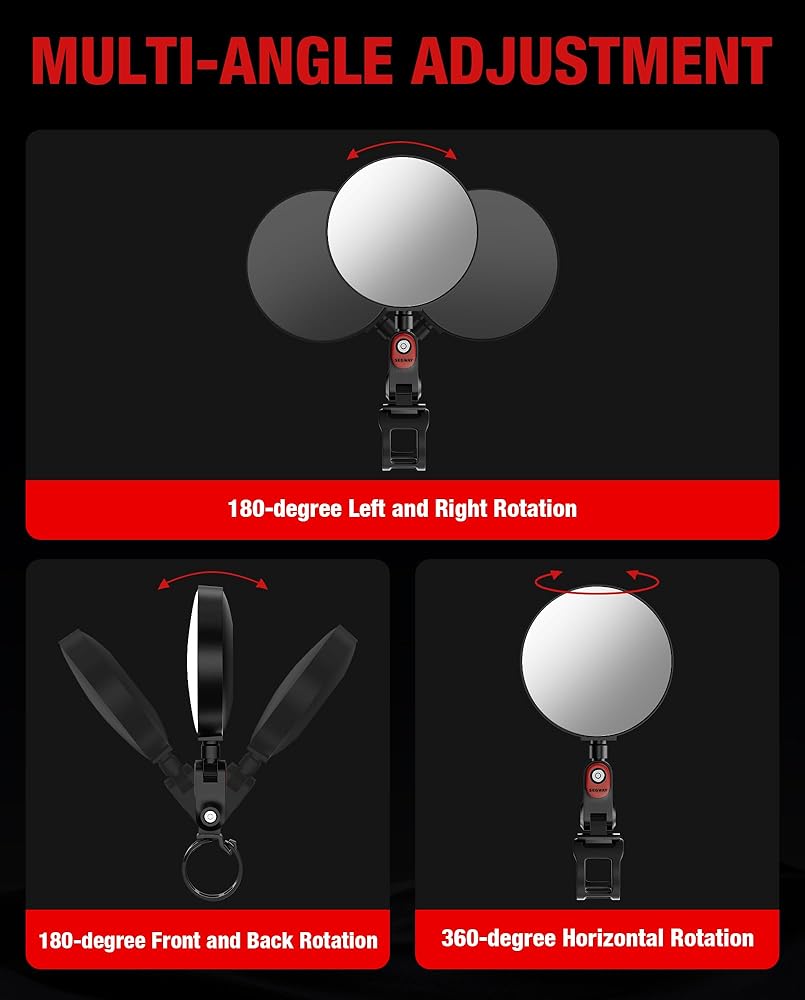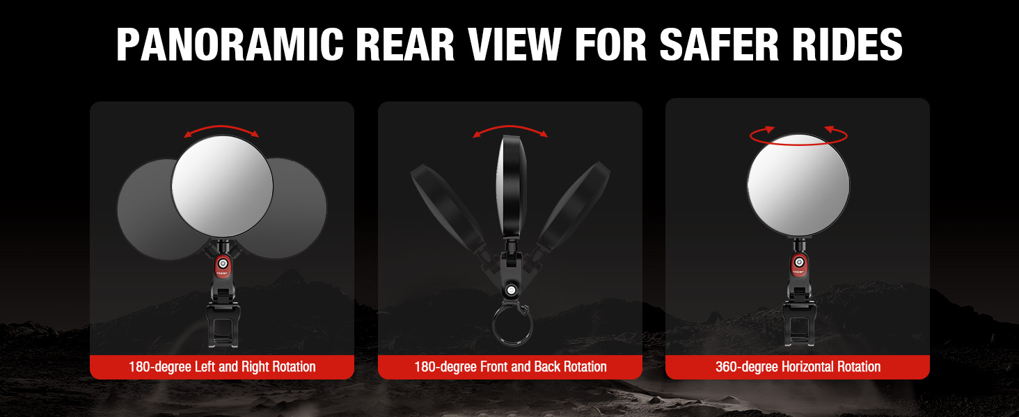 【FLEXIBLE AND CONVENIENT】Unique adjustable design allows easy mirror angle adjustments to find the most comfortable viewing angle.The mounting bracket adjusts 180° forward/backward and left/right, fine-tune your view with a 360° rotating mirror face for the perfect line of sight. Whether turning or changing lanes, you can effortlessly monitor rear conditions.