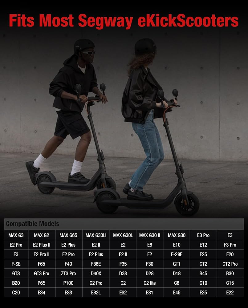 【PERFECT FIT】Specially designed for the SEGWAY scooter series to ensure seamless compatibility and secure installation, enhancing the reliability of your scooter. Almost Compatible with all Ninebot by Segway Kickscooters MAX G3 / MAX G2 / MAX G65 / MAX G30 / E3 / E3 Pro / E2 / E2 Pro / E2 Plus / F3 / F3 Pro / F2 / F2 Pro / F2 Plus / E8 / E10 / E12 / F20 / F25 / F30 / F35 / F40 / F65 / GT1 / GT2 / GT2 Pro / GT3 / GT3 Pro / ZT3 Pro / D18 / D28 /D38 / D40 / B45 / B30 / B20 P65 / P100 / C2 / C2 Pro / C8 / C10 / C15 / C20 / ES4 / ES3 / ES2L / ES2 /ES1 / E45 / E25 / E22. ATTENTION: NOT COMPATIBLE WITH Ninebot by Segway Air T15 Kickscooter.