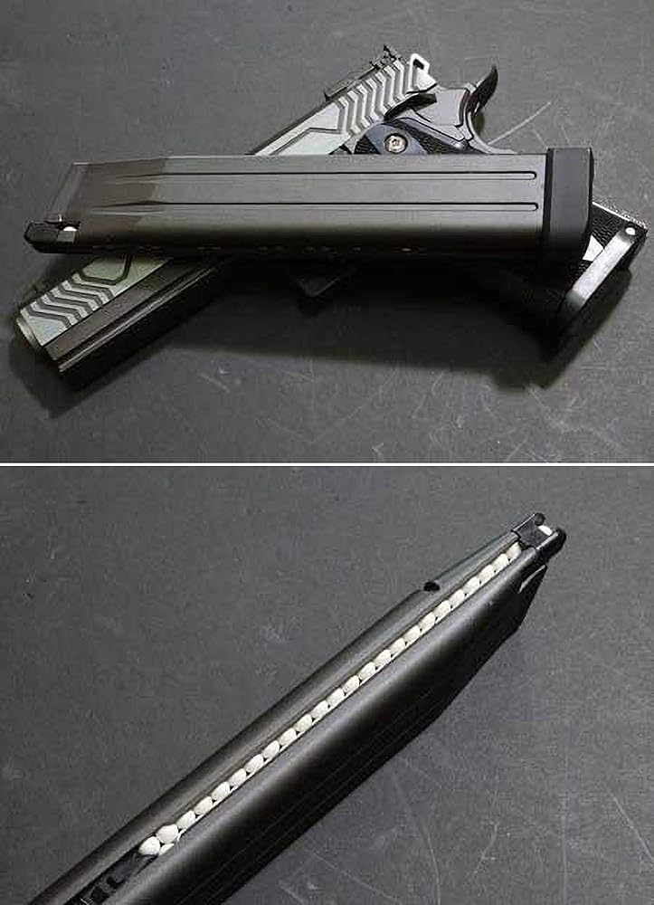 Need more firepower? Of course you do! The CQB Master extended Hi-CAPA magazine by WE-Tech will not only provide you an aggressive new look, but twice the fire power in both gas capacity and bb capacity! Hold more rounds than a Mac 11 and increase your tactical advantage! Turn your HI-CAPA into a Super HI-CAPA today with this extended mag. Spend more time shooting and less time reloading! Compatibility: WE-Tech, Tokyo Marui, Armorer Works and other similar Hi-Capa Airsoft pistols Capacity: 52 rounds Gas Type: Green Gas, Red Gas, Propane
