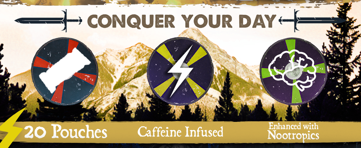 NOOTROPICS: Our pouches are enhanced with our own Nootropic Blend that pairs perfectly with caffeine to give you Odin level focus to go along with your Berserker Energy! Alpha GPC & L-Tyrosine for enhanced focus, mental clarity and quick thinking. Theobromine helps deliver the caffeine smoothly so you get zero crash. GABA & Taurine work together to reduce stress and support a steady performance throughout the day. Keep your mind sharp and you body fueled for whatever battle comes your way!