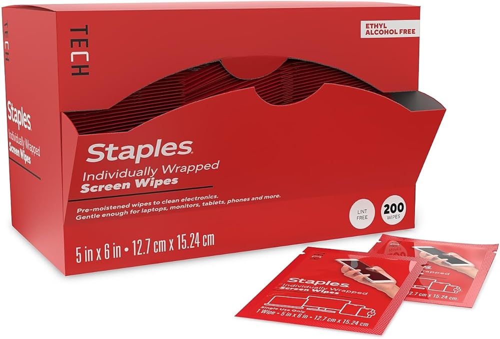 • Staples TECH Individually Wrapped Screen Wipes are designed to keep your electronic devices spotless