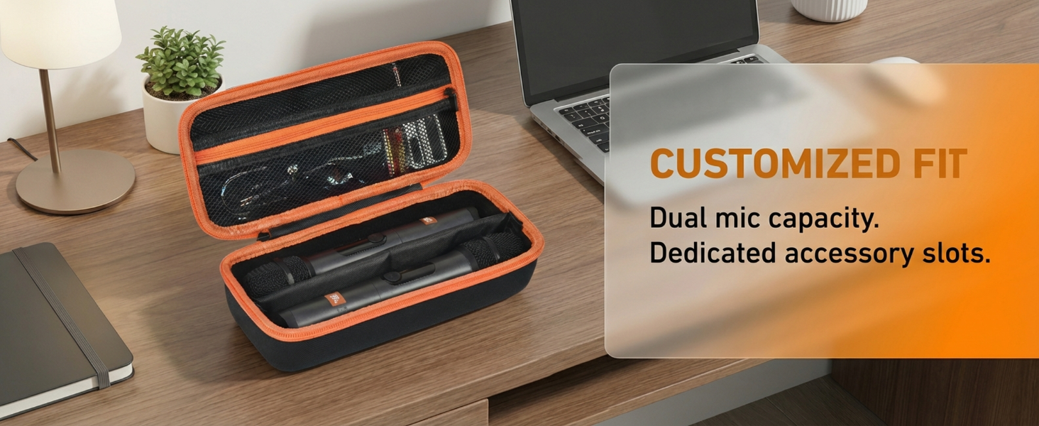 Fit for JBL Wireless Microphones Organizer Case: Dual microphone storage bag compatible with JBL Wireless Two Microphone System & for JBL PartyBox Wireless Mic. Designed to stores 2 handheld microphones, receiver, AA batteries, and data cables. Ideal for home karaoke, family parties and singing. External: 10.63*5.12*3.15 in; Internal: 9.84*3.94*1.97 in. Includes 1 compact mics carrying case and 2 foam windscreens; microphones and other accessories are not included