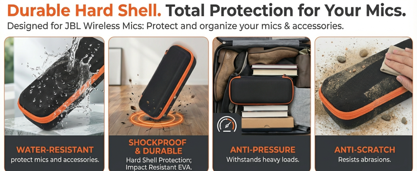 Hard EVA Protection Microphone Carrying Case for JBL Wireless Mics: This hard EVA storage organizer for JBL partybox microphone uses a rigid, durable EVA shell with padded lining to deliver water-resistant, shockproof, anti-scratch, and wear-resistant protection- helping guard your karaoke microphone wireless from drops, bumps, and suitcase pressure during karaoke parties, DJ gigs, rehearsals, and travel. The zip-around closure also helps keep dust out for clean storage between events