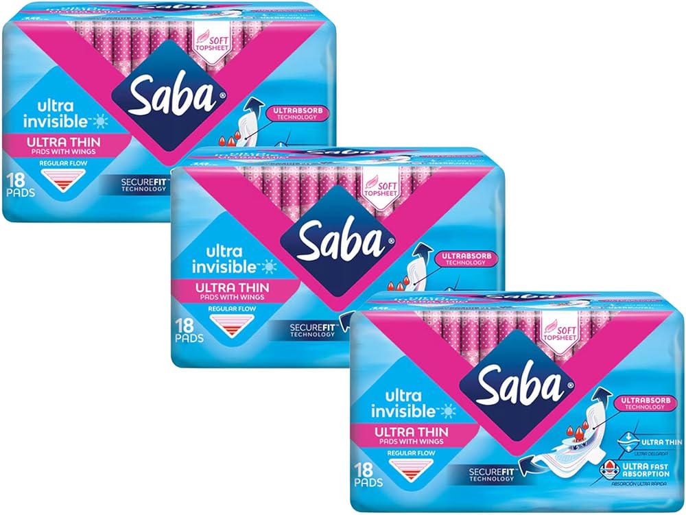 Experience exceptional everyday comfort and discreet, reliable protection with SABA Ultra Invisible™ Ultra Thin Pads, now offered in a convenient and value-packed 3-pack designed to give you confidence, freshness, and peace of mind every single day. Created by SABA, a trusted name in feminine care, these pads are thoughtfully engineered for women seeking dependable protection without sacrificing comfort or discretion. Perfect for regular flow days, each ultra-thin pad is designed with innovative SecureFit™ technology that gently conforms to your body's natural shape. This adaptive design creates a secure, personalized fit that stays in place as you move, bend, and go about your daily routine. Whether you're at work, running errands, relaxing at home, or traveling, these pads move naturally with you for all-day confidence. At the core of each pad is the advanced Ultrabsorb™ system, which rapidly absorbs fluid and distributes it evenly across three strategically placed absorption zones. This technology helps lock in moisture quickly, keeping you feeling dry, fresh, and comfortable for longer periods of time. The result is dependable protection you can trust throughout the day, even during busy or active moments. Crafted with soft, breathable materials, SABA Ultra Invisible™ pads are gentle on sensitive skin and designed for lasting comfort. Their flexible, discreet profile ensures they remain virtually invisible under clothing, providing reliable protection without added bulk. The winged design adds an extra layer of security by helping keep the pad firmly in place, reducing shifting and offering greater peace of mind during everyday activities. Ideal for daily feminine care or regular menstrual flow, this convenient 3-pack is perfect for stocking up on a product you can rely on. With comfort, discretion, and trusted performance in every pad, SABA Ultra Invisible™ Ultra Thin Pads make it easy to feel protected, confident, and comfortable—day after day.