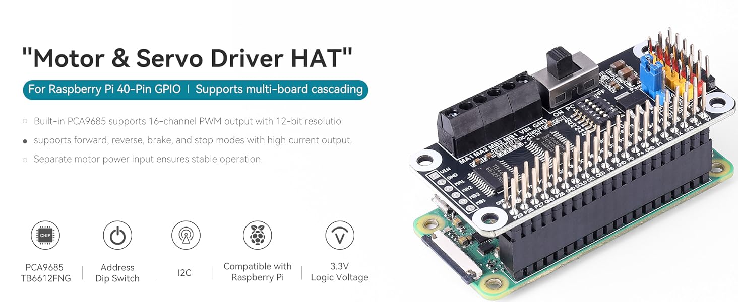 Motor & Servo Driver HAT for Raspberry Pi 40-Pin Header, PCA9685 16-Channel 12-bit PWM + TB6612FNG Dual DC Motor Driver, Drives 2 DC Motors & 6 Servos, I2C Control, 6-12V VIN