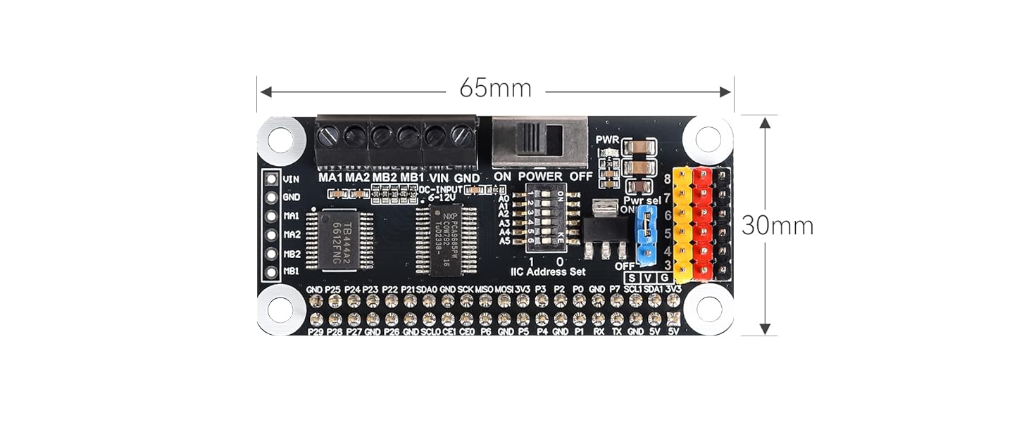 Designed for Raspberry Pi, this HAT can drive 2 DC motors and 6 servos at the same time, controlled via I2C registers for synchronized motion.