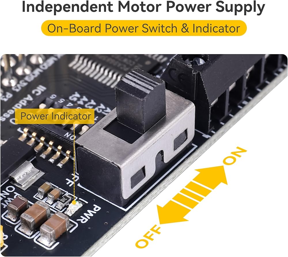 Built on PCA9685 with 16 PWM channels and 12-bit (4096-step) resolution, up to 4µs resolution at 60Hz; onboard 25MHz oscillator.