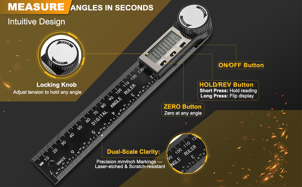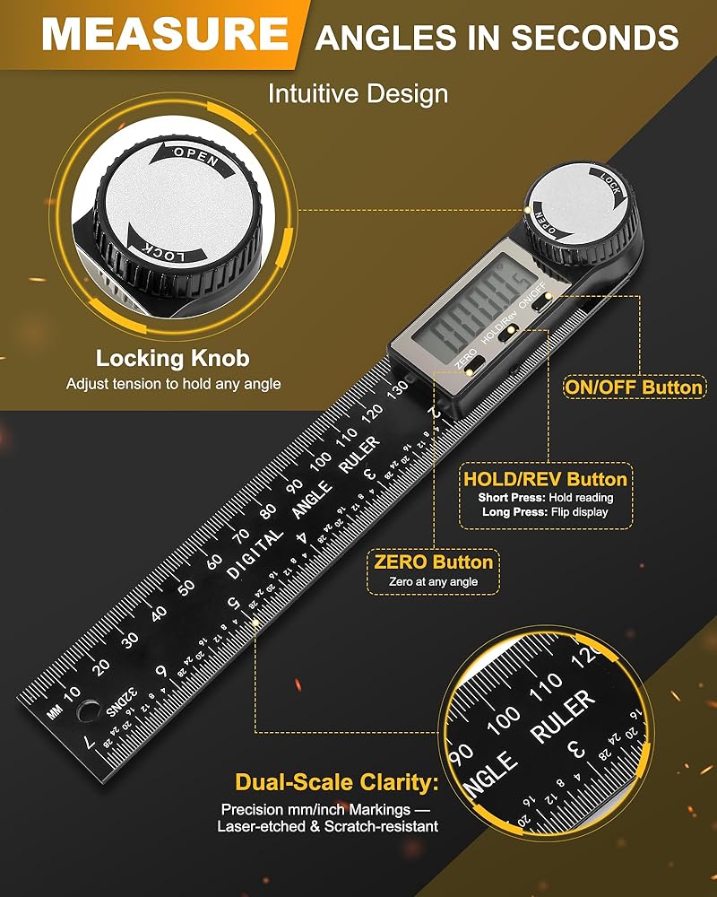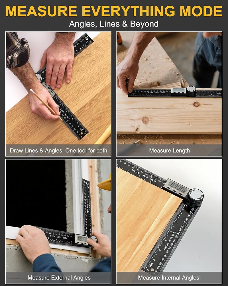 Measure Angles & Lengths in One Tool: This 2-in-1 digital protractor and ruler quickly measures internal and external angles as well as straight lengths—no need to switch tools. Perfect for woodworking, carpentry, home projects, or on-site jobs where accuracy matters