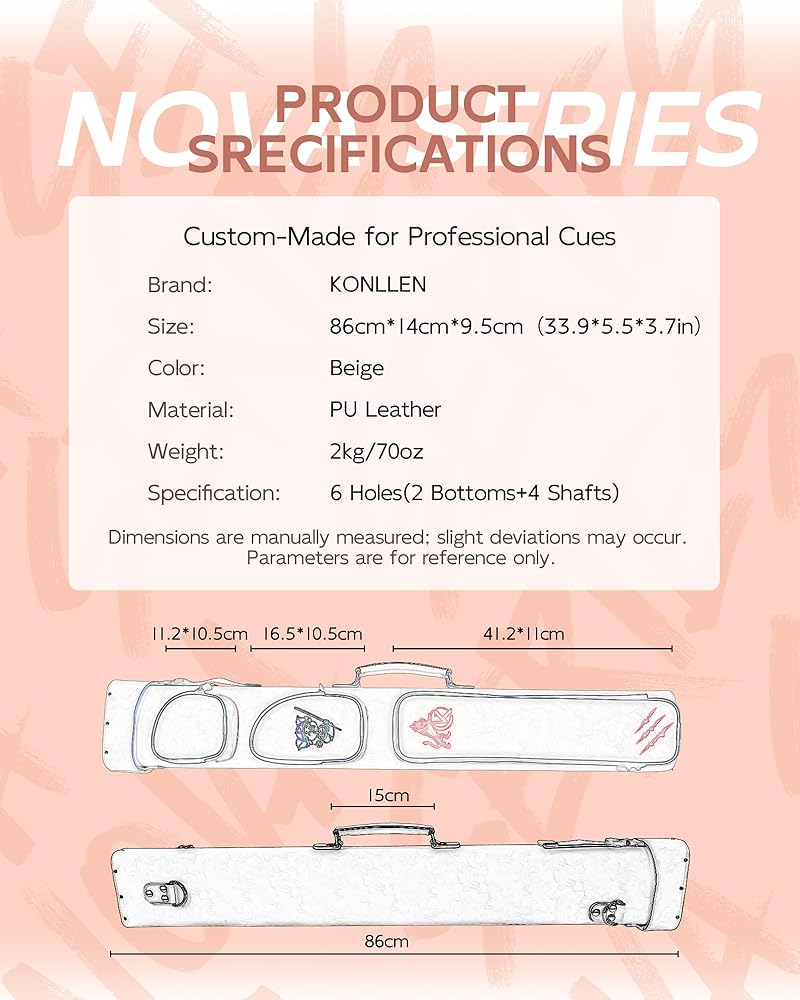 KONLLEN Pool Cue Case 2x4 Hard Pool Stick Case with Multi-pocket Holds 2 Butts 4 Shafts Billiards Cue Bag with Adjustable Shoulder Straps for Adults (Pink)