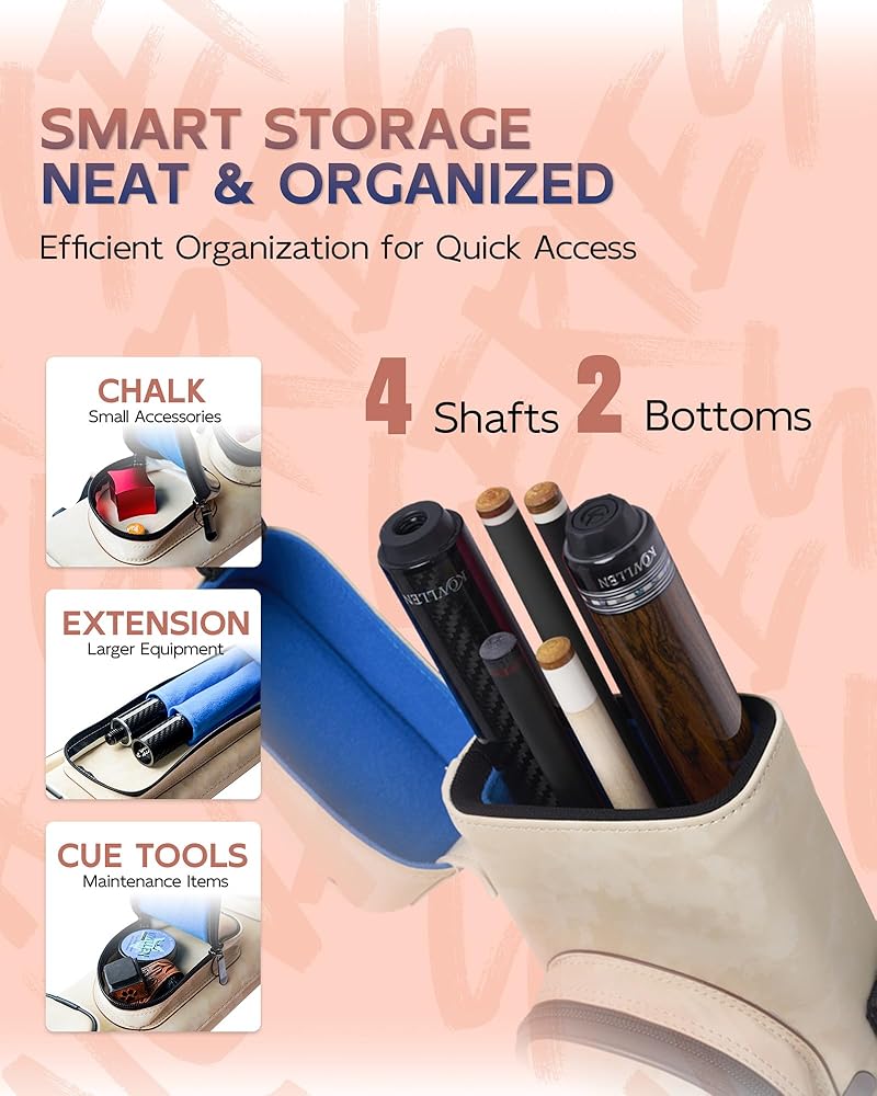 Organized Storage for Cue Accessories Multiple pockets help store chalk, gloves, tools, tips, and extensions, keeping your gear easier to organize and quicker to access.