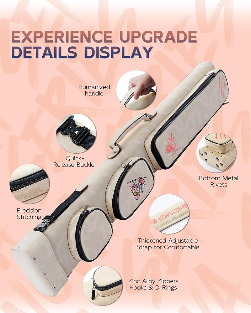 Premium Look with Durable Hardware PU leather, fine stitching, zinc alloy zippers, hooks, D-rings, and bottom rivets give this billiard cue case an upgraded look and durable construction.