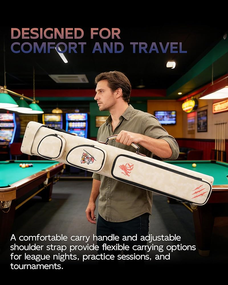 Easy to Carry for Travel and Play Top handle, adjustable shoulder strap, and quick-release buckle make this pool cue carrying case convenient for pool halls, league nights, and tournaments.