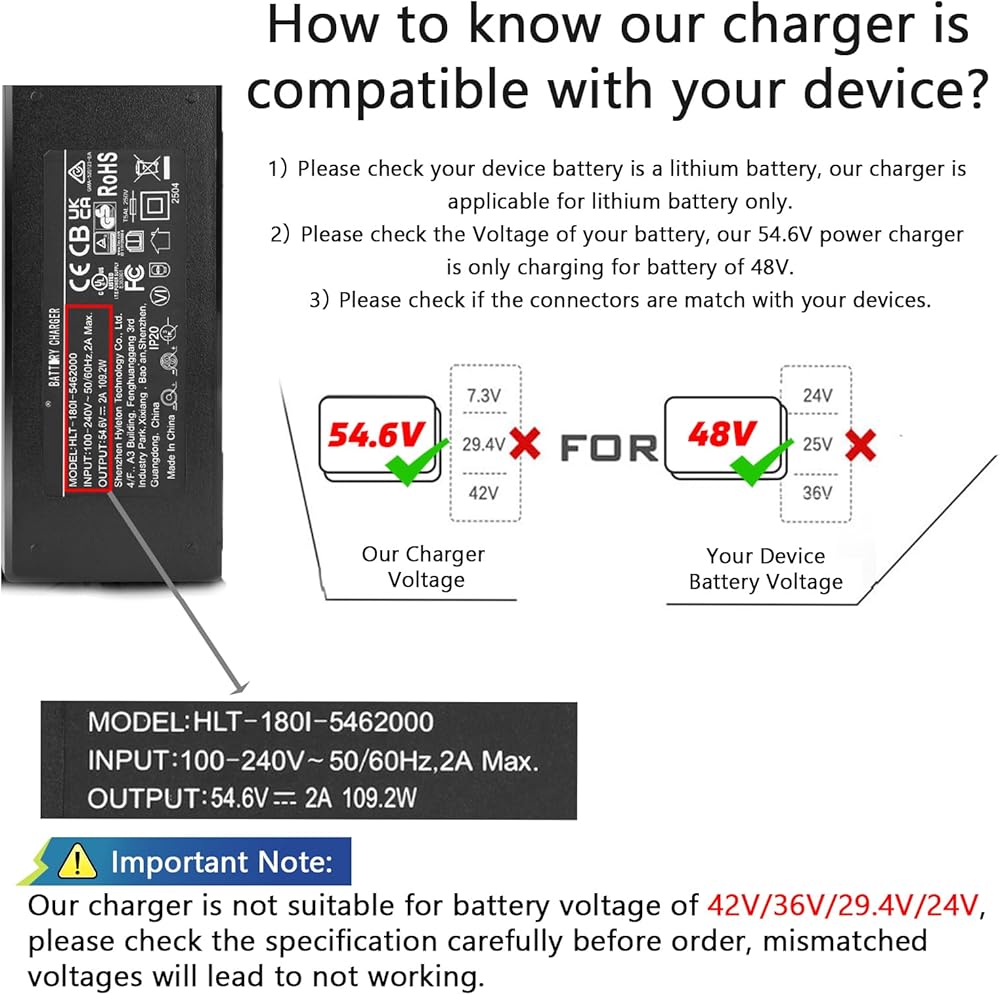 54.6V/2A Electric Vehicle Charger] Input: 100-240V 50/60Hz Output: 54.6V/2A For 48V lithium-ion e-bikes/e-scooters only. Not compatible with 36V or 24V batteries. Verify battery specifications before purchase.