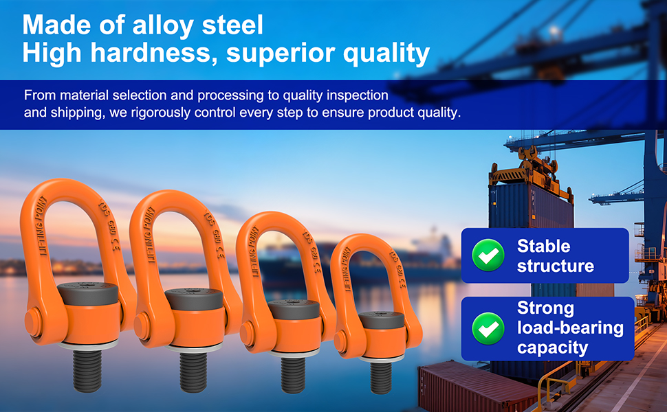 【Multi-scenario Use】Multi-specification sizes of the AVCMOTO high-grade alloy steel lifting Universal Swivel hoist rings are widely used in large and small lifting operations in yard, garage, industry, logistics, construction, port, bridge, machinery, coal mine, petroleum, stadium and other industries.
