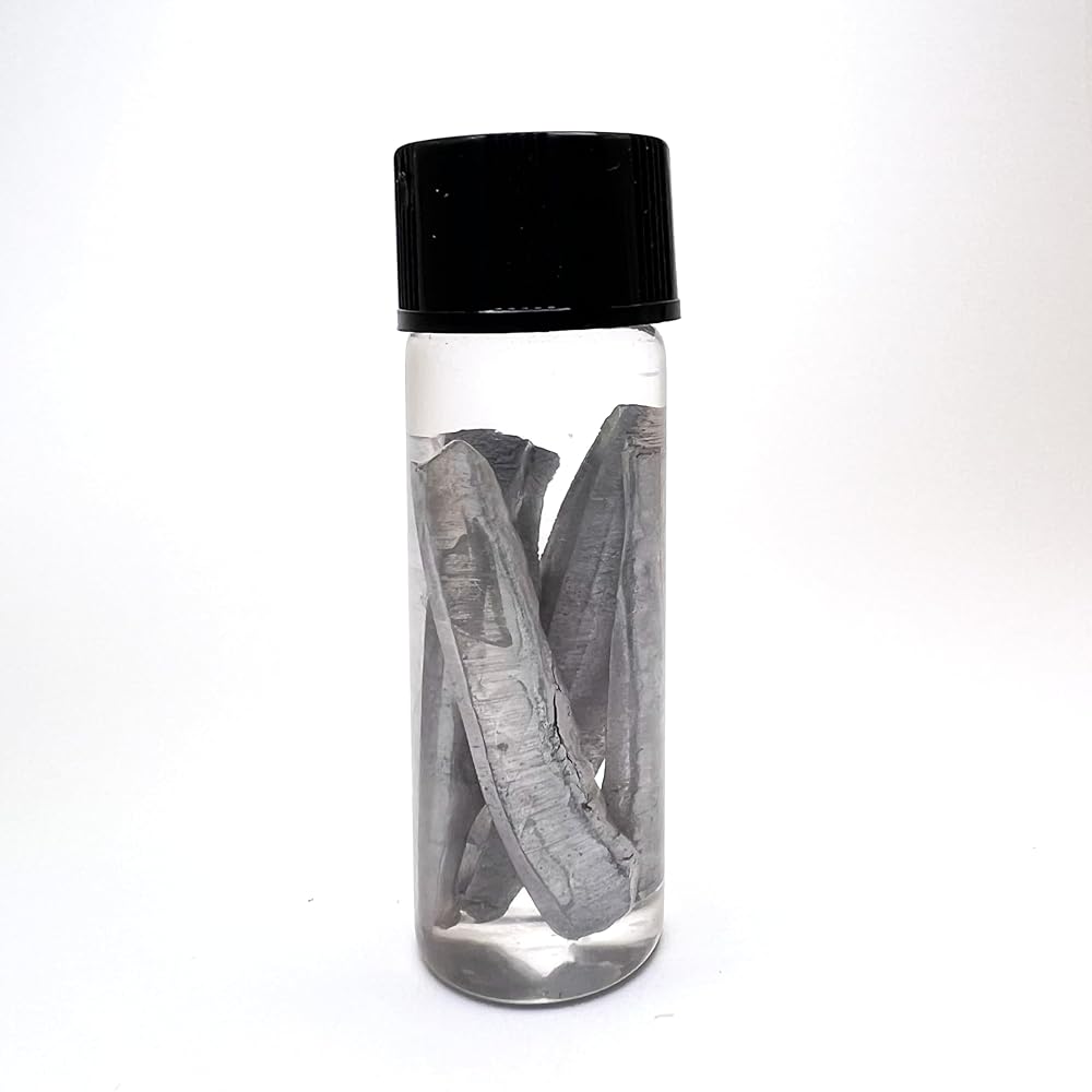 This Sodium Metal Element Sample contains genuine 99.9% pure sodium (Na), representing Element 11 of the periodic table. Each specimen is packaged in a clear 1 dram glass vial and offered in two size options: 0.5 gram and 1 gram, allowing collectors and educators to choose the quantity that best fits their needs. The metal is stored in mineral oil, a commonly used storage method that helps protect sodium from air and moisture while preserving the appearance of the metal during storage. Each vial is fitted with a custom-designed protective vial sleeve created specifically to help safeguard the glass vial during transport and routine handling. These sleeves help reduce the risk of breakage while maintaining a clean and professional presentation suitable for element collections and educational environments. These sodium specimens are ideal for periodic table collections, chemistry education, science demonstrations, and element enthusiasts seeking a genuine sample of this alkali metal.