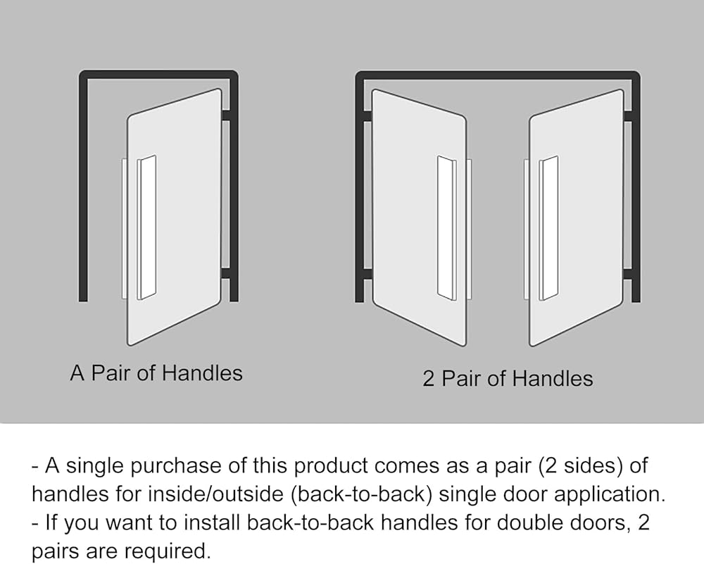 - Each purchase includes a pair of push/pull handles for the inside and outside of a single door. For back-to-back installation on double doors, two pairs are required.