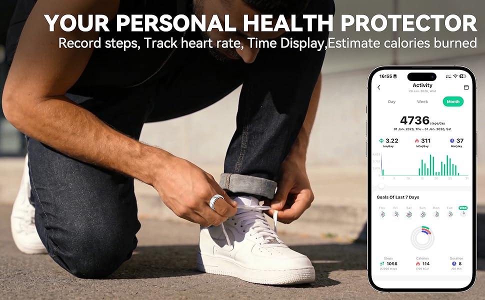 【Fitness tracker Ring】Warchody Smart ring can assist you in recording multidimensional data of various sports with advanced built-in chips and powerful IP68waterproof technology,such as running,swimming,cycling,hiding,hiking and so on.Meanwhile smart fitness ring automatically track your workout route,sport time,steps,heart rate,speed,calories burned,and distance