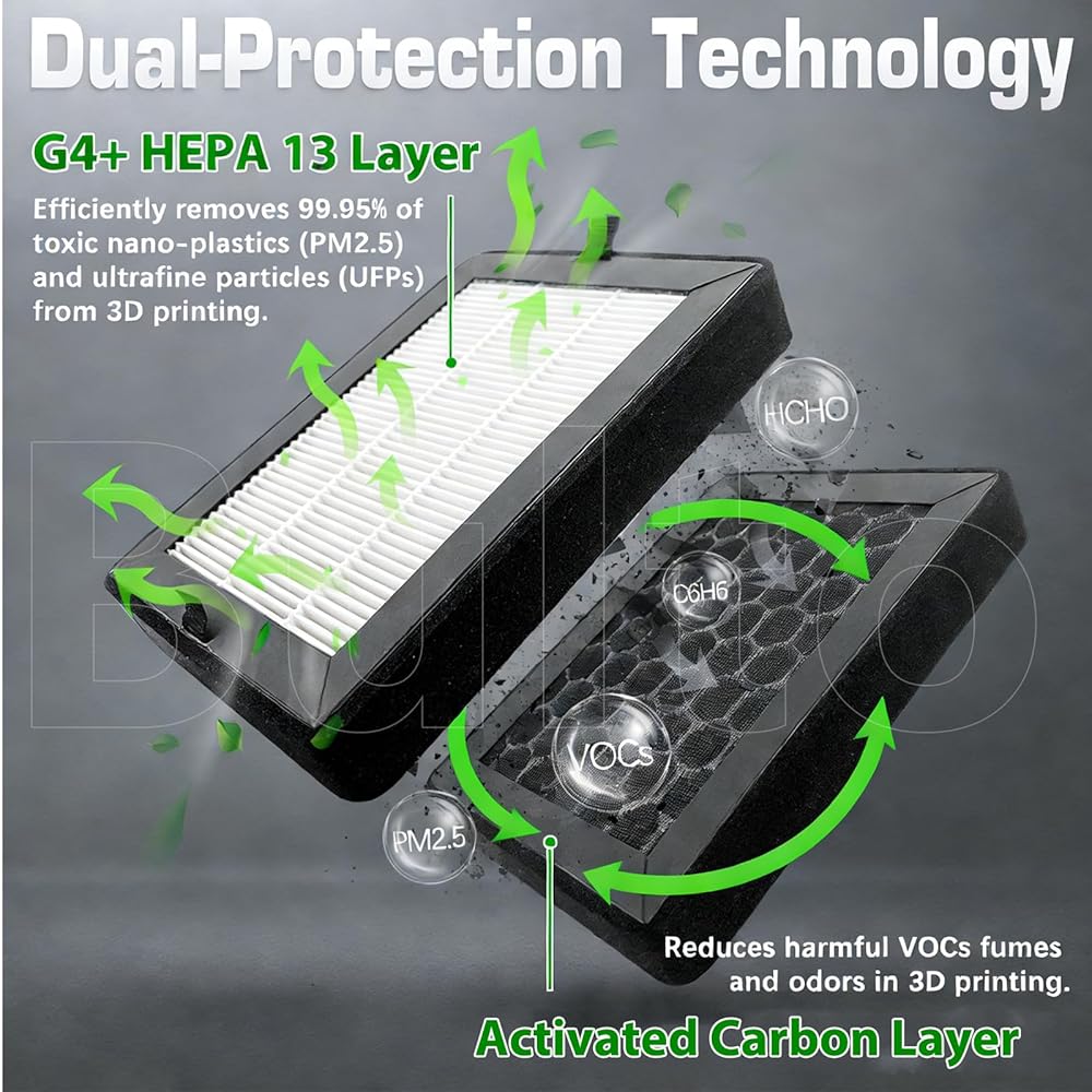 Dual-Layer Advanced Filtration System: Upgrade your 3D printer P2S filter with a powerful dual-protection structure. The HEPA 13 layer captures 99.95% of toxic nano particles (PM2.5) and ultrafine particles (UFPs), while the activated carbon P2S layer effectively absorbs VOCs, formaldehyde (HCHO), fumes and unpleasant odors generated during printing