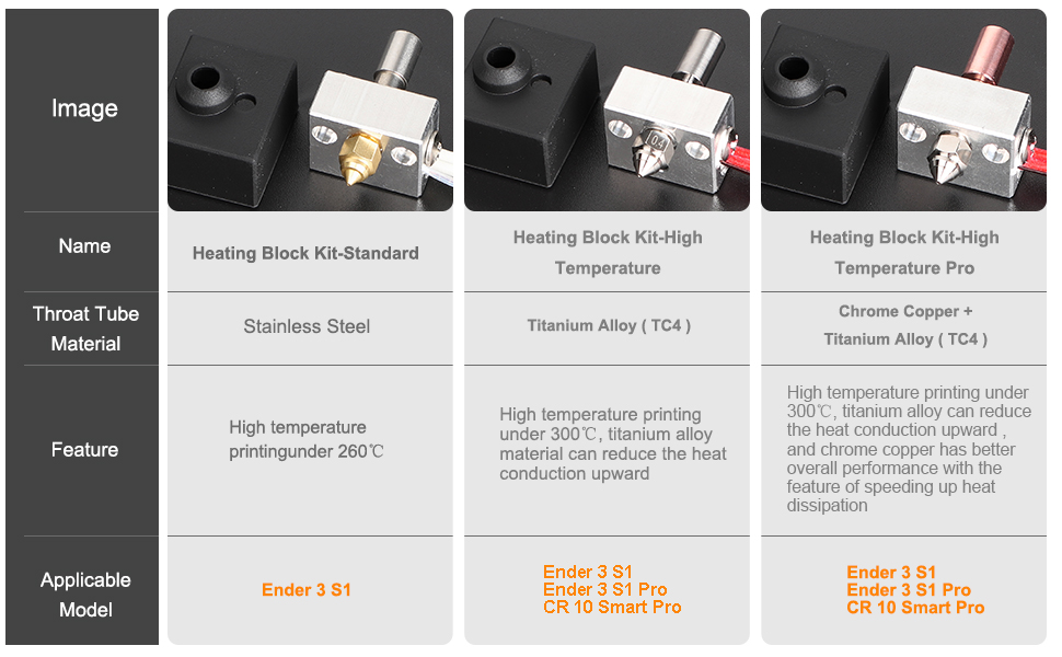 Package include - Plated chrome Copper & Titanium Alloy Throat Tube x1, Heating Block x1, Silicone sock x1, Nickel Copper plated nozzle x1 (if your printing temperature is over300C, please remove the silicone sock before printing). Compatible with Ender 3 S1/Ender 3 S1 PRO/CR 10 Smart Pro.