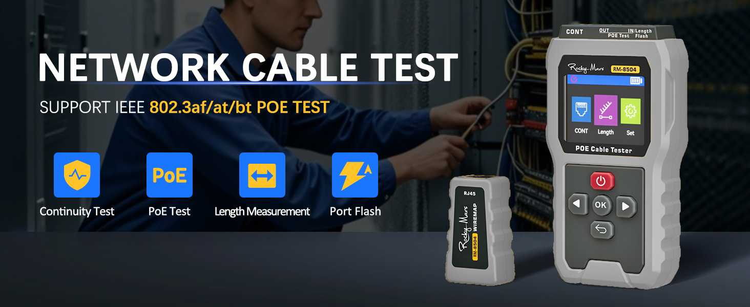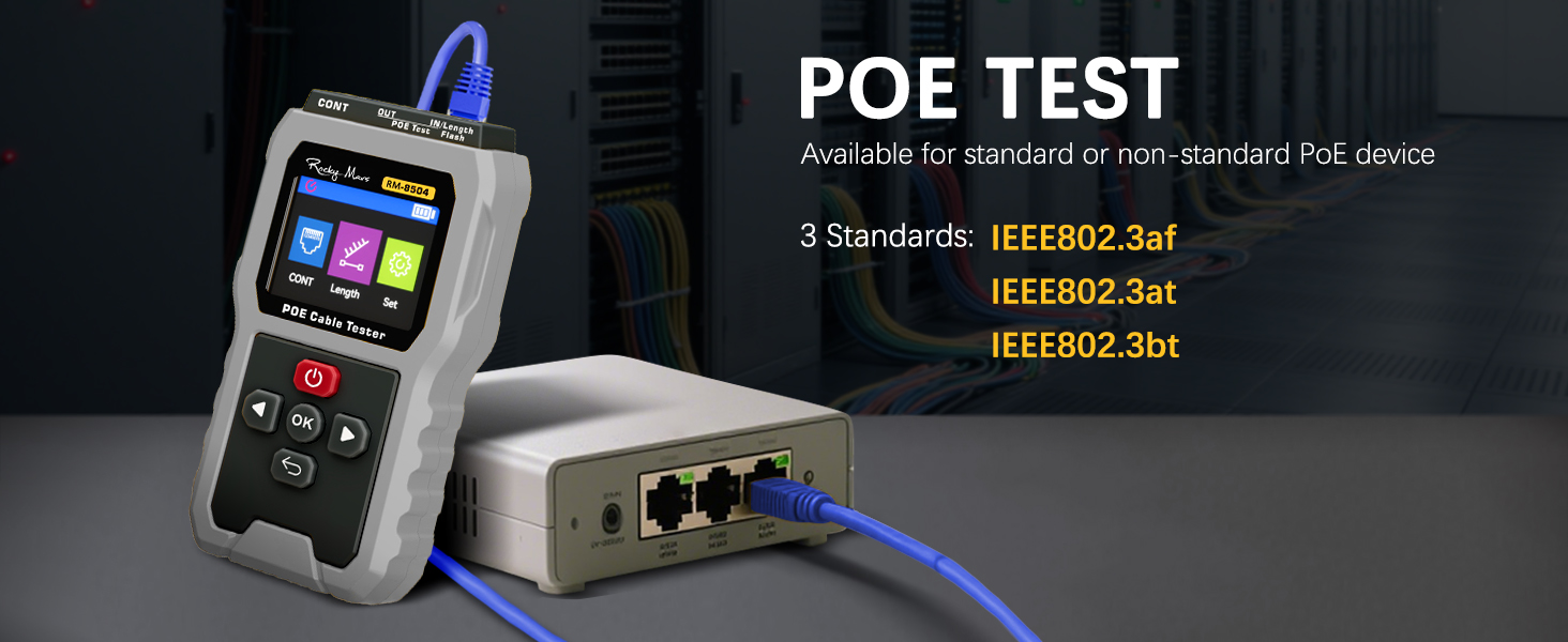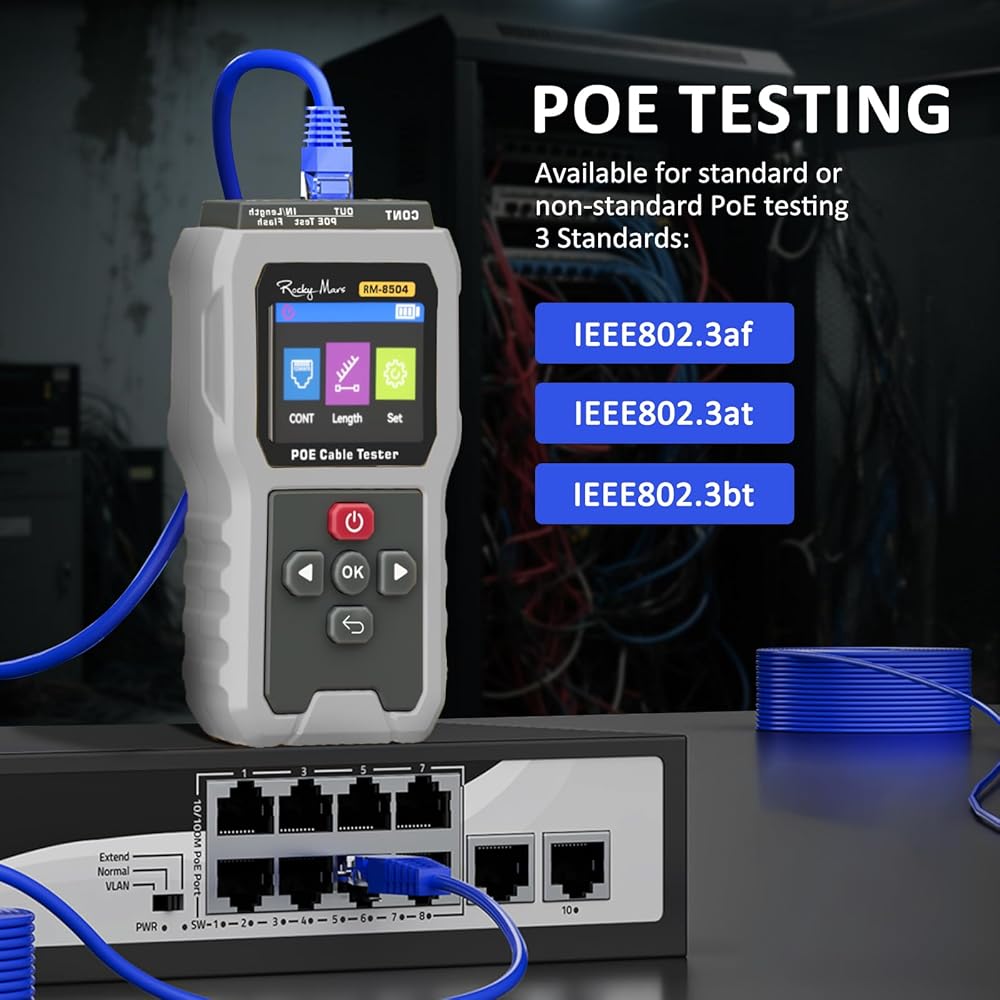 Comprehensive PoE Testing: Verify both standard IEEE 802.3af/at/bt and non-standard PoE (5-60V DC) with 2-80W load detection. Perfect for confirming power supply from switches or injectors to powered devices (PDs).