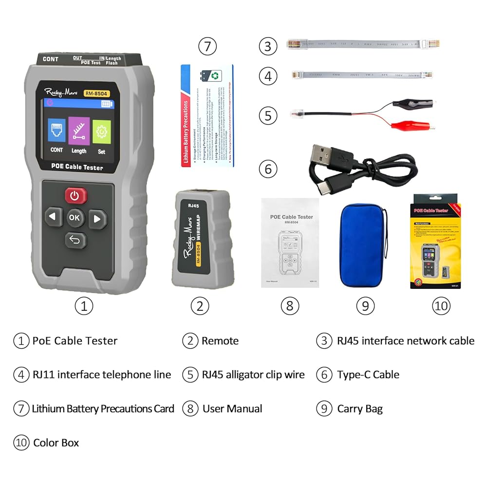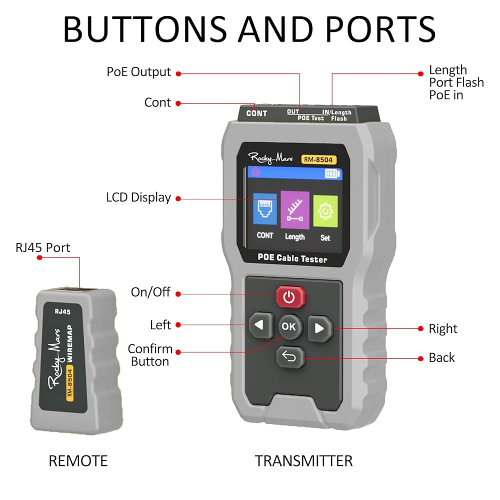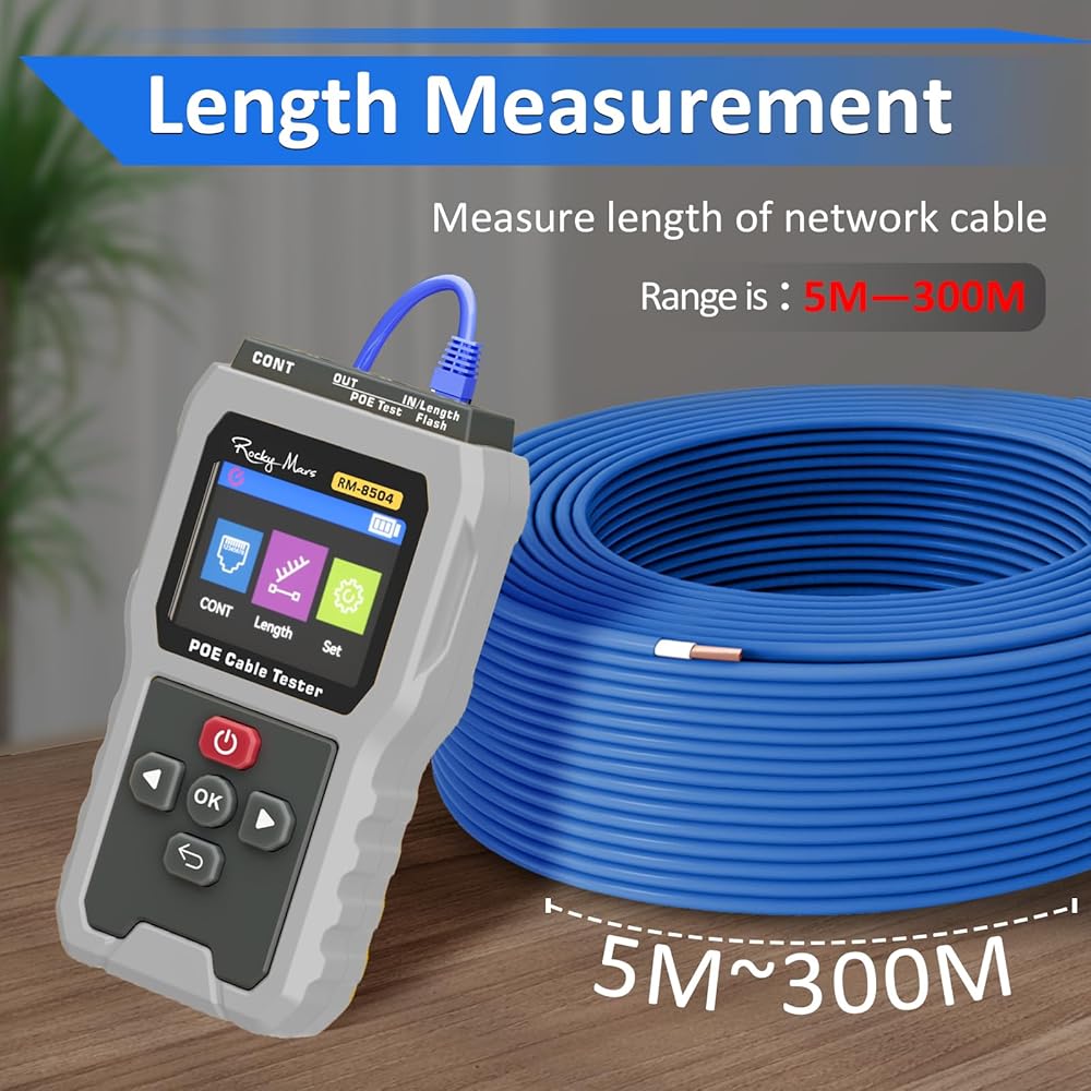 Cable Length Measurement: Measures Ethernet cable lengths for CAT5/CAT6 from 5 to 300 meters. An essential tool for installation verification and troubleshooting long cable runs efficiently.