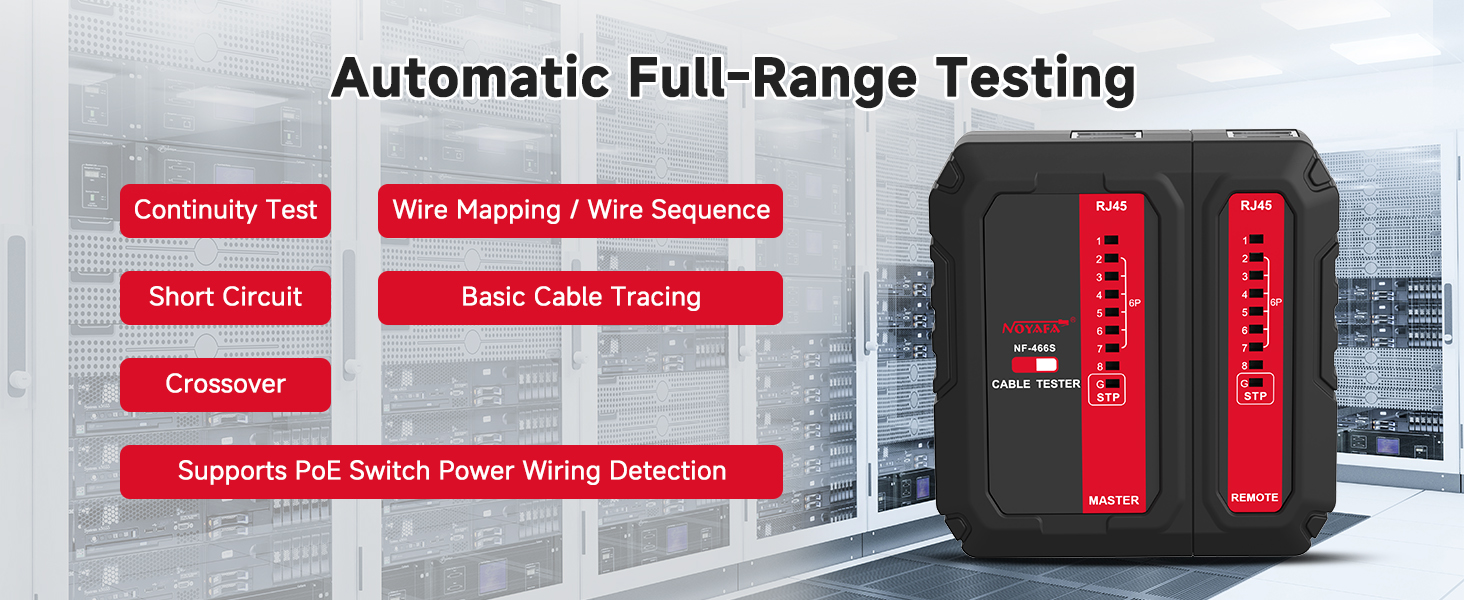Automatic Full-Range Testing: Automatically runs all necessary tests and inspections with no complicated manual operations; simplifies the process of checking cable continuity, open circuits, short circuits and miswiring, saving time and effort for both professionals and DIY users