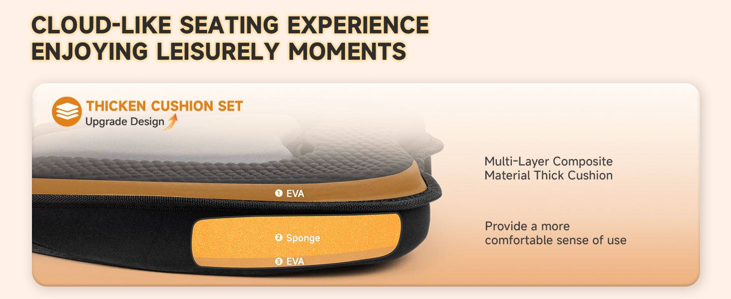 Cloud-Comfort Cushion: Upgraded with a three-layer structure, the kayak seat cushion features a generous thickness of 1.97 inches (5cm) for optimal support and comfort during your travels. The bottom has Hook and Loop tape for a secure fit that prevents shifting, allowing you to fully enjoy your time