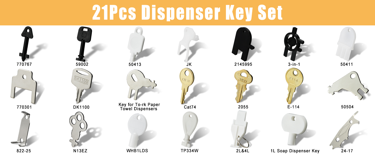 Paper Towel and Toilet Paper Dispenser Key Set for Paper Towel and Waste Receptacles, C-Fold Paper Towel, Mounted Roll Towel, Seat Cover, Sanitary Napkin and Toilet Tissue, Mounted Liquid Soap, Mounted Toilet Tissue, Jum-bo Roll Toilet Tissue, Paper Cup, Interleaved Bath Tissue Dispenser