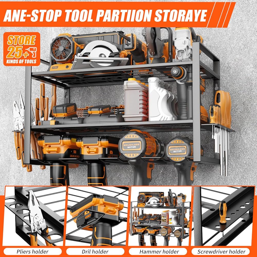Wall Mount Tool Organizer, 3-Layer Heavy Duty Metal Rack for 4 Drills, with Screwdriver and Hammer Holder, 150 Lbs Capacity, Garage and Workshop Storage (trumpet, 3-4)