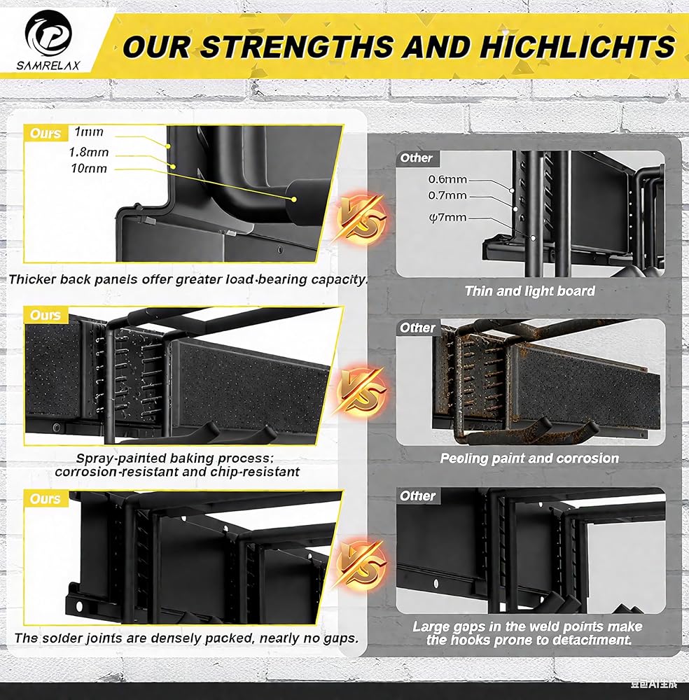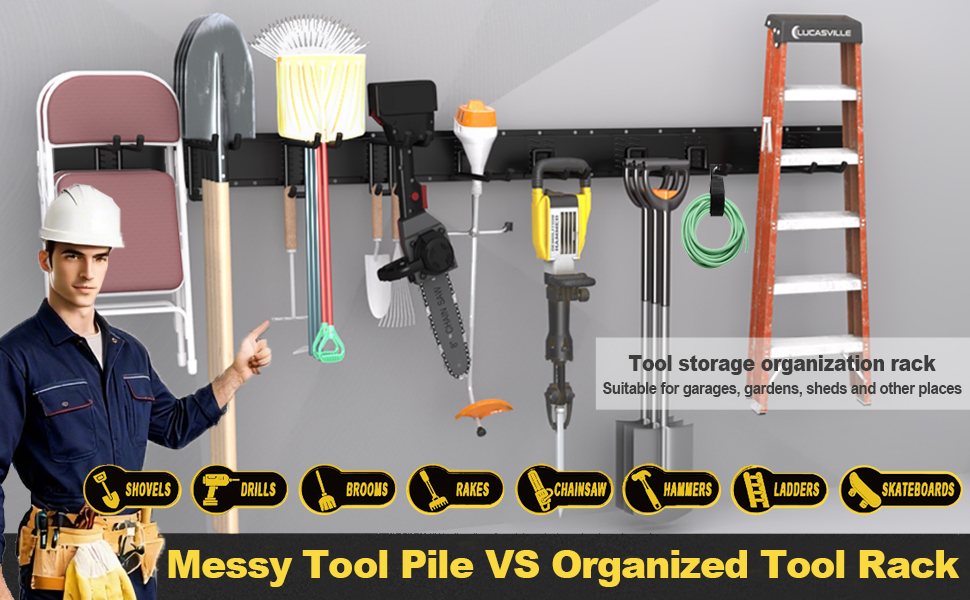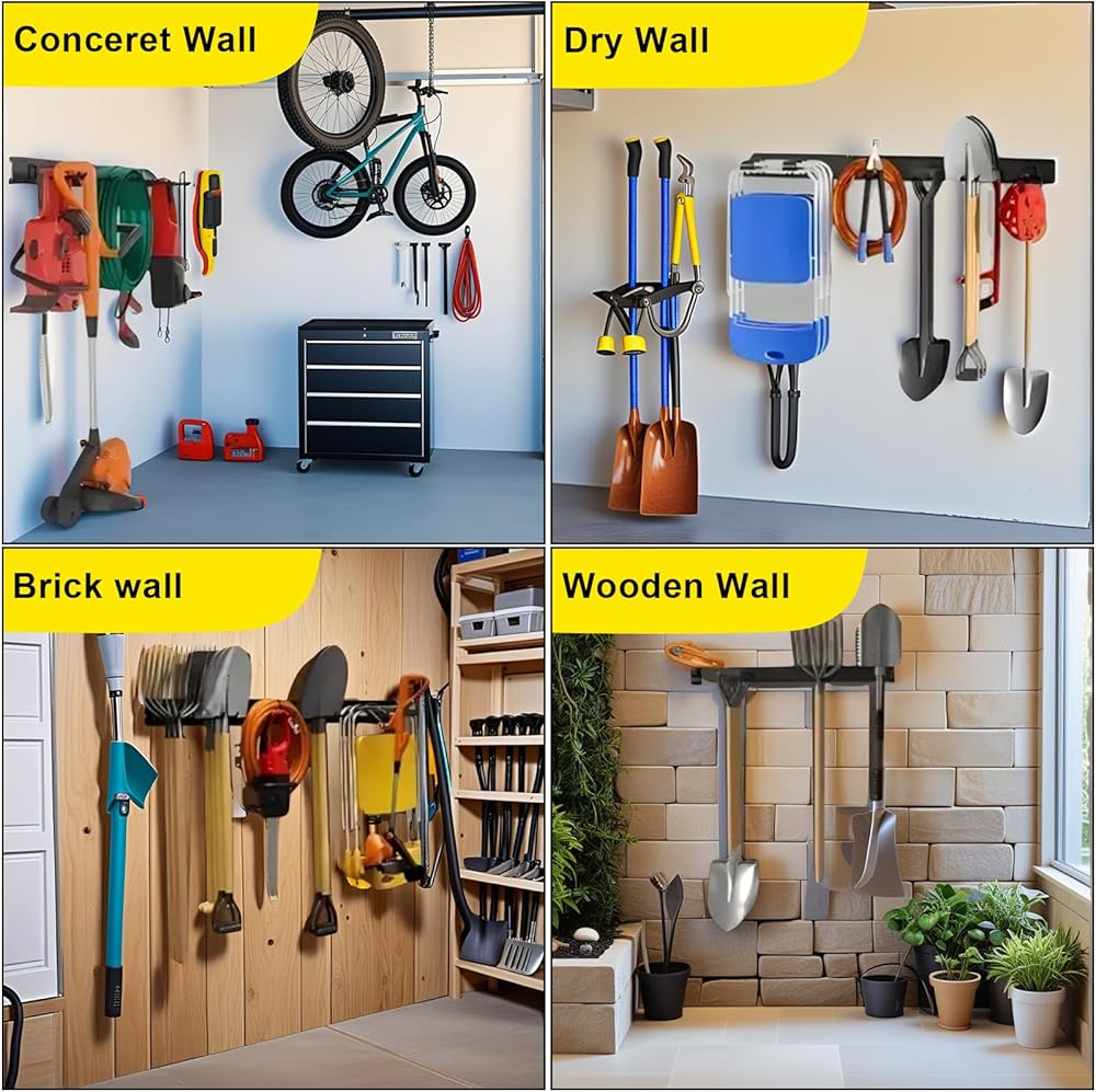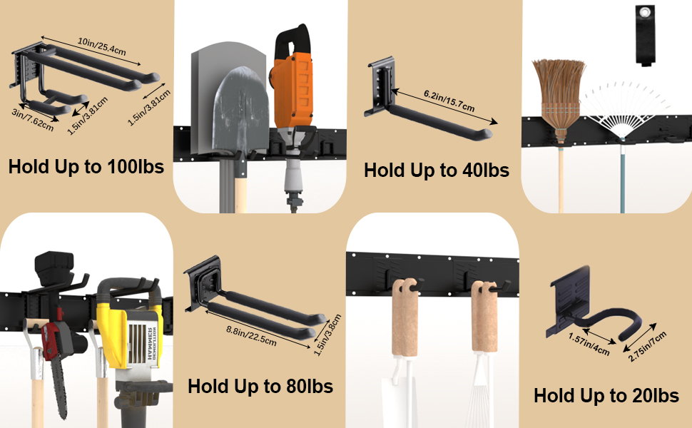 【Multifunctional】 Garage racks for storage can be installed in garages to hang garden tools and folding chairs; heavy duty garage wall hooks can be installed in gyms to store dumbbells and yoga mats; garden tool storage can be installed in repair rooms to hang wrenches, chainsaws, and other equipment; garage wall organizer can be installed on balconies or in bedrooms to hang everyday cleaning tools.
