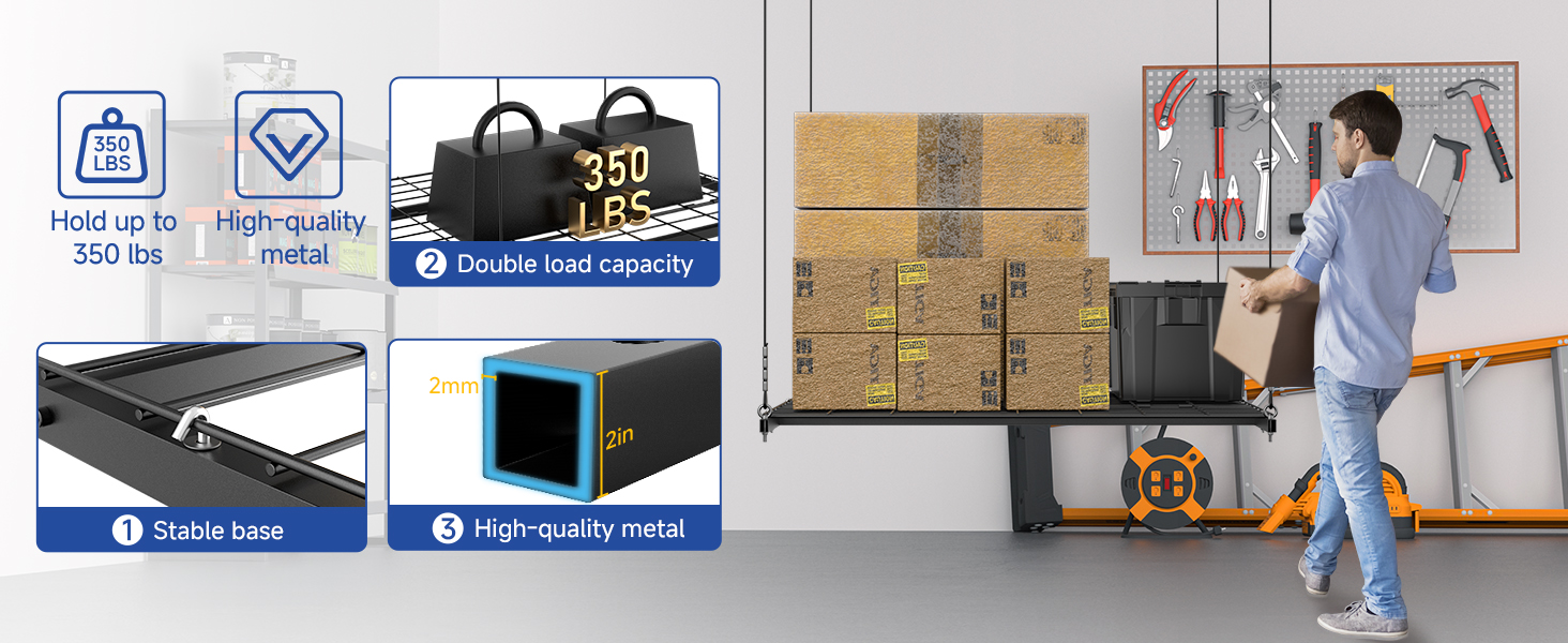 • 【350LBS Heavy-Duty Overhead Garage Storage Rack】Crafted from high-quality metal with reinforced perimeter support, this lifting stand offers a remarkable 350LBS load capacity. Ideal for most wood and concrete ceilings, it helps save garage storage space while significantly improving convenience in daily life.