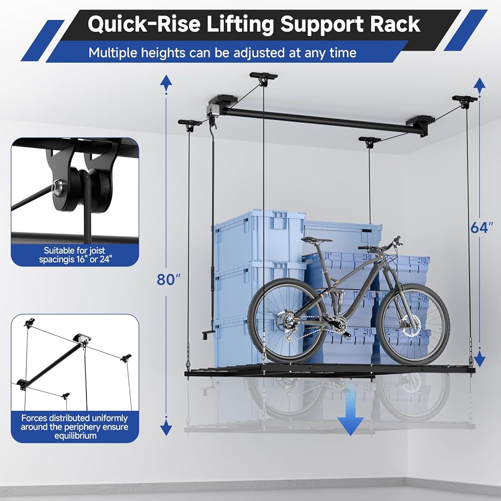 • 【Multi-Stabilized Structure】This garage storage lift Features a dual steel cable ceiling mount that enhances overall stability and minimizes the risk of breakage. The weight is evenly distributed around the perimeter, reducing violent shaking during operation and ensuring safe and smooth lifting.