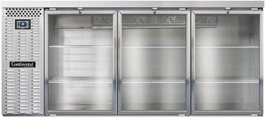 Continental Refrigerator BBC79S-SS-GD Three Section Glass Door Refrigerated Back Bar Cooler, 79" W x 34-3/4"H, Stainless Steel Exterior & Shallow Depth