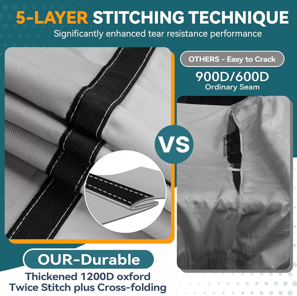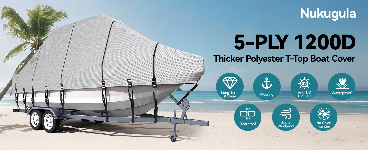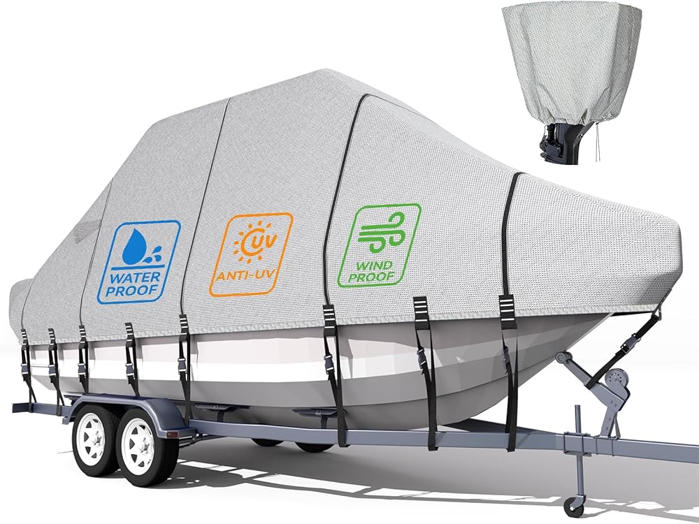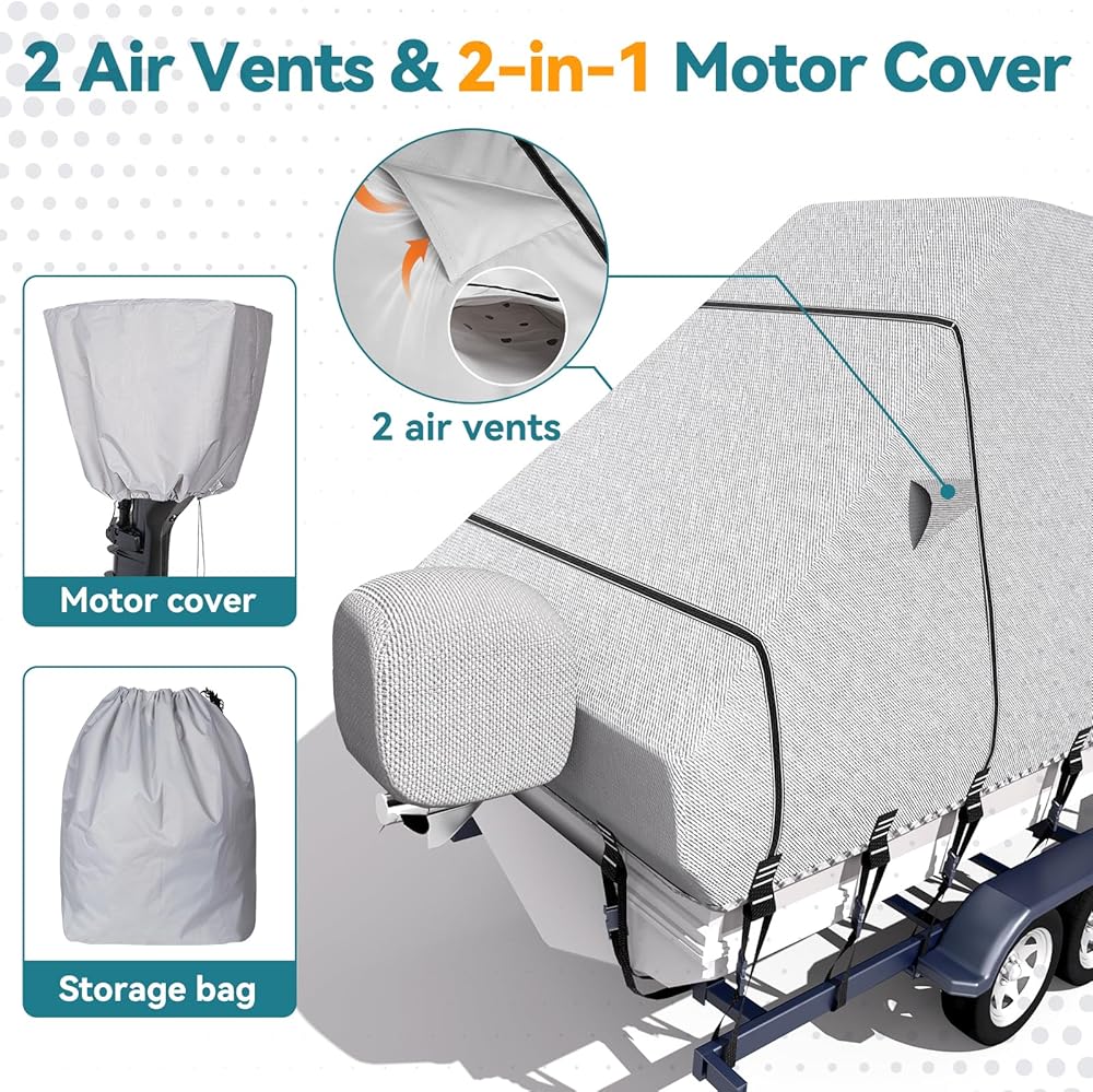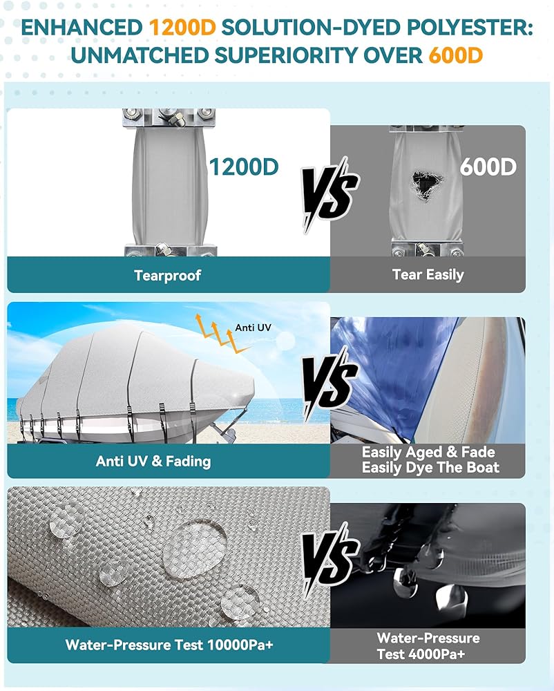 𝑯𝒆𝒂𝒗𝒚 𝑫𝒖𝒕𝒚 𝑻𝒆𝒂𝒓𝒑𝒓𝒐𝒐𝒇 𝑪𝒆𝒏𝒕𝒆𝒓 𝑪𝒐𝒏𝒔𝒐𝒍𝒆 𝑩𝒐𝒂𝒕 𝑪𝒐𝒗𝒆𝒓: Made of thickened 5 layers 1200D(quality is better than the falsely labeled 900D and 1200D) Solution Dyed Marine Grade Polyester(Waterproof Surface + Anti UV coating + 1200D Solution Dyed Oxford + PU Coating + PU Backing), WEIGHT 8.5 OZ and has passed 520LBf tensile strength test, far superior to other 300D/420D/600D Oxfords (maximum tension :300-450 lb); Double-stitched seams for the higher capability of anti-scratch and anti-tear! Our boat cover won't get tearing or punctures easily!