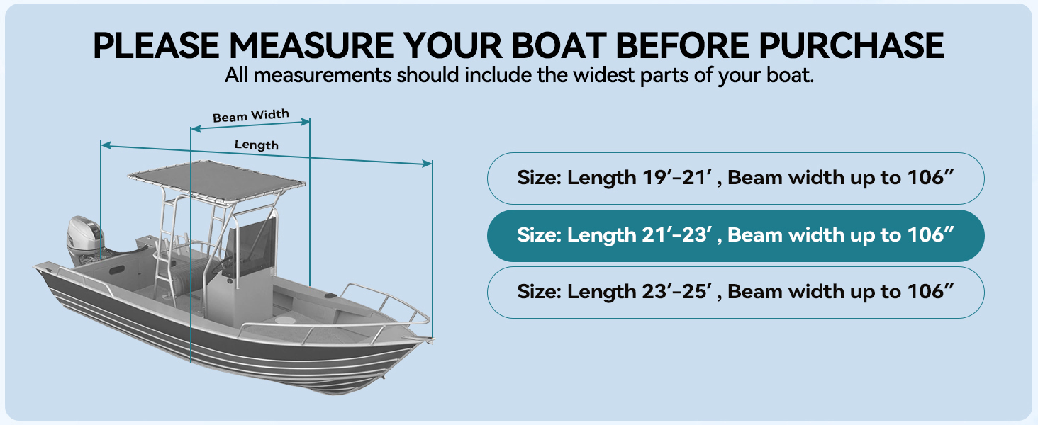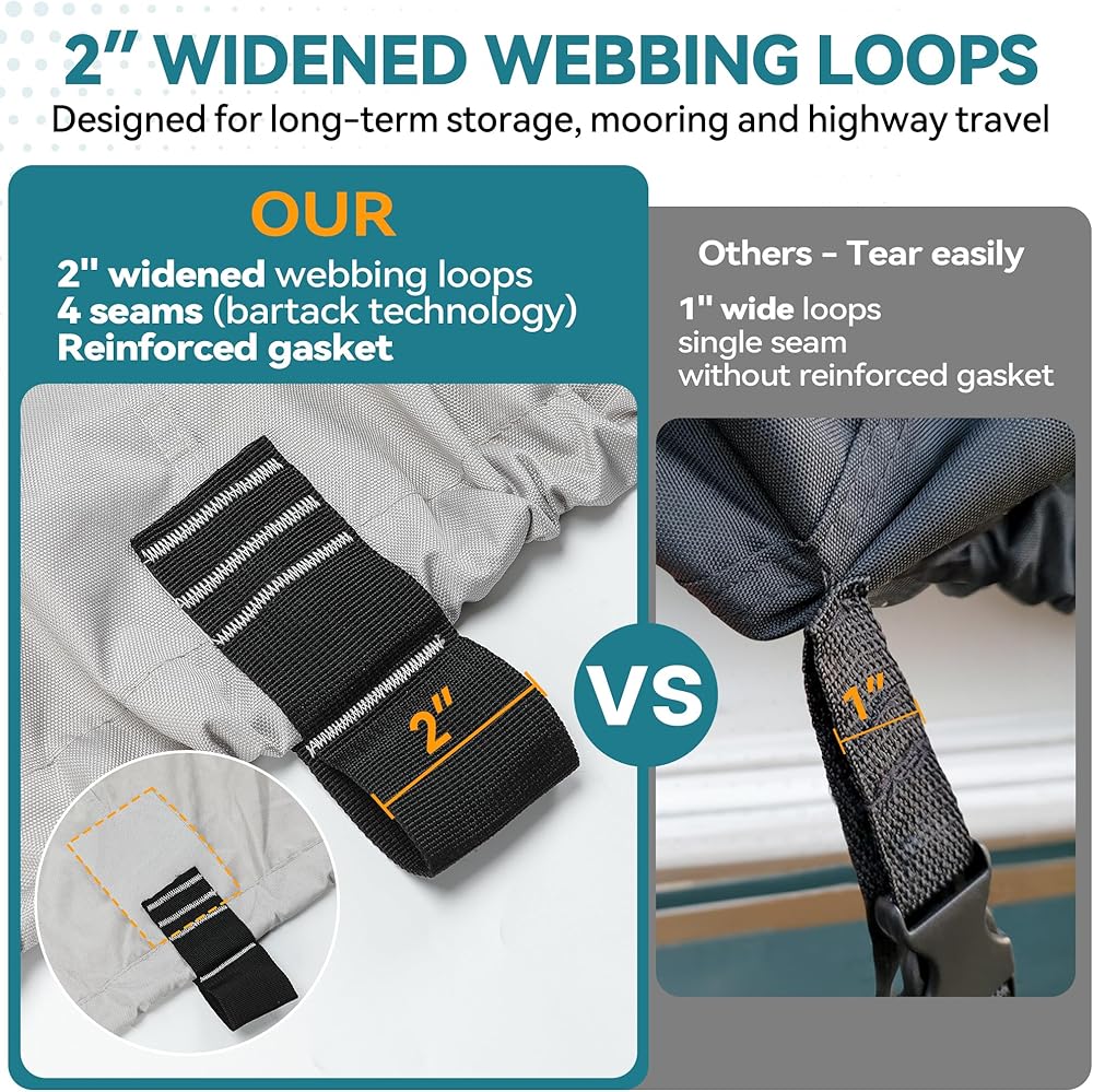 21 𝑷𝑪𝑺 𝑾𝒊𝒏𝒅𝒑𝒓𝒐𝒐𝒇 𝑺𝒕𝒓𝒂𝒑𝒔 & 𝑬𝒍𝒂𝒔𝒕𝒊𝒄 𝑺𝒉𝒐𝒄𝒌 𝑪𝒐𝒓𝒅: Built-in Widened 2" Wide Webbing loops are sewn with 4-Thread Stitching, better to achieve mooring function; 21PCS adjustable straps with premium buckles can withstand up to 160 lbf of pull to prevent the cover from blowing off when trailering. Elastic shock cord is sewn into the entire bottom hem to provide a tight and custom fit around your boat, providing 360 degree of all-around protection for your boat.