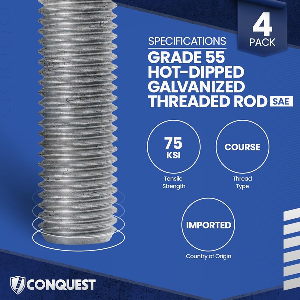 Conquest Fasteners Grade 55 Threaded Rod (ASTM F1554), 3/4" Diameter, 10 Thread Size, 36" Length, Right Hand Threads Designed for Structural Anchoring, Hot Dip Galvanized - Made in USA (4 Pack)