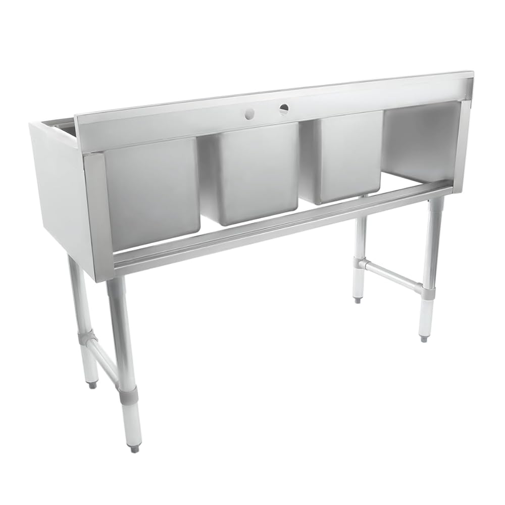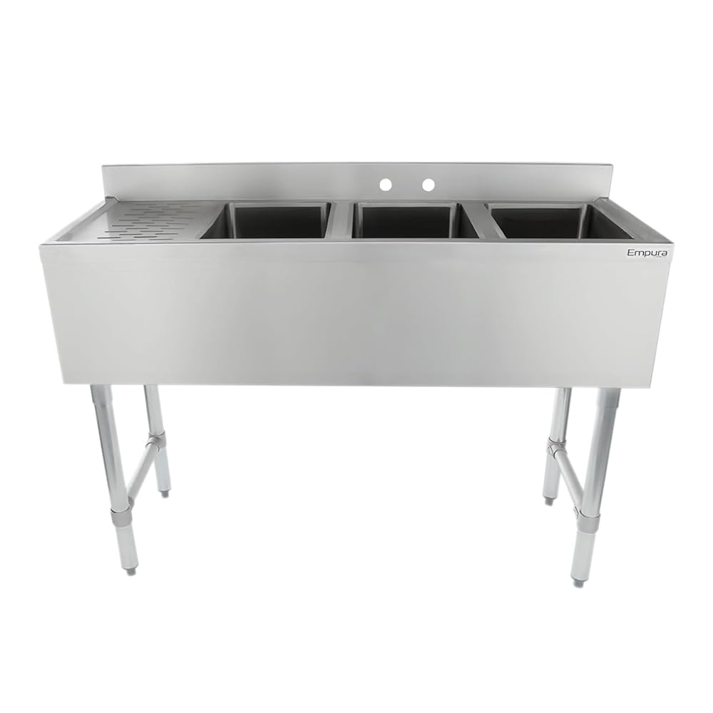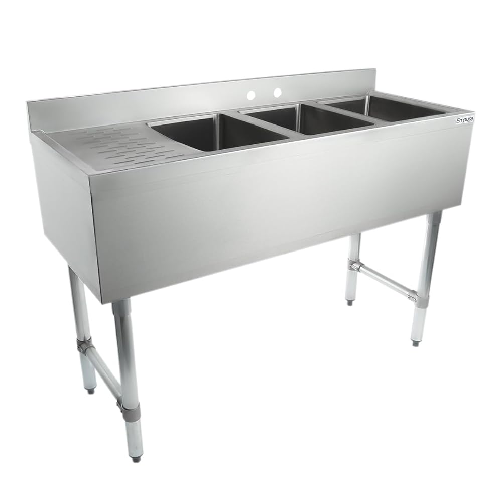 The Underbar Sink with three compartments is an essential fixture for any commercial kitchen or food service establishment, designed to optimize efficiency and maintain hygiene standards. Featuring three spacious bowls, each measuring 10" x 14" x 10", this sink provides ample room for washing, rinsing, and sanitizing dishes, utensils, and food items. The layout is ideal for streamlining workflows, allowing staff to perform multiple tasks simultaneously without overcrowding the workspace. This sink is constructed from high-quality 18-gauge 304 stainless steel, known for its durability and resistance to rust and corrosion. This ensures a long-lasting product that can withstand the rigorous demands of busy kitchen environments. The polished stainless steel finish not only enhances the aesthetic appeal but also facilitates easy cleaning, allowing for quick maintenance and compliance with health and safety regulations. A notable feature of this underbar sink is the 12" left drainboard, providing a convenient area for drying dishes or preparing ingredients. This additional space enhances functionality and helps keep the workspace organized, reducing clutter and improving efficiency during peak hours. The sink is equipped with a 1.5" IPS drainage system, ensuring efficient waste removal and preventing water pooling, which is critical in maintaining a clean working environment. Designed for easy installation, this underbar sink seamlessly fits into various kitchen configurations, making it a versatile choice for restaurants, bars, catering services, and more. Its robust construction and practical design make it an indispensable tool for professionals who prioritize cleanliness and efficiency in their operations. With this Underbar Sink, enhance the productivity and organization of any commercial kitchen while ensuring the highest standards of sanitation are met.
