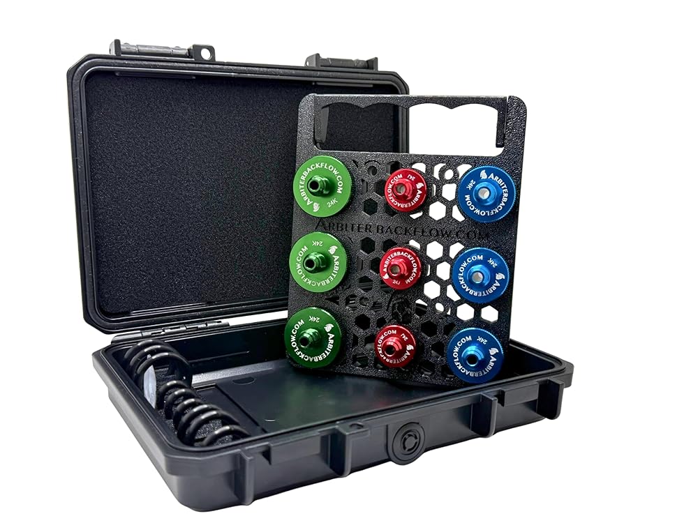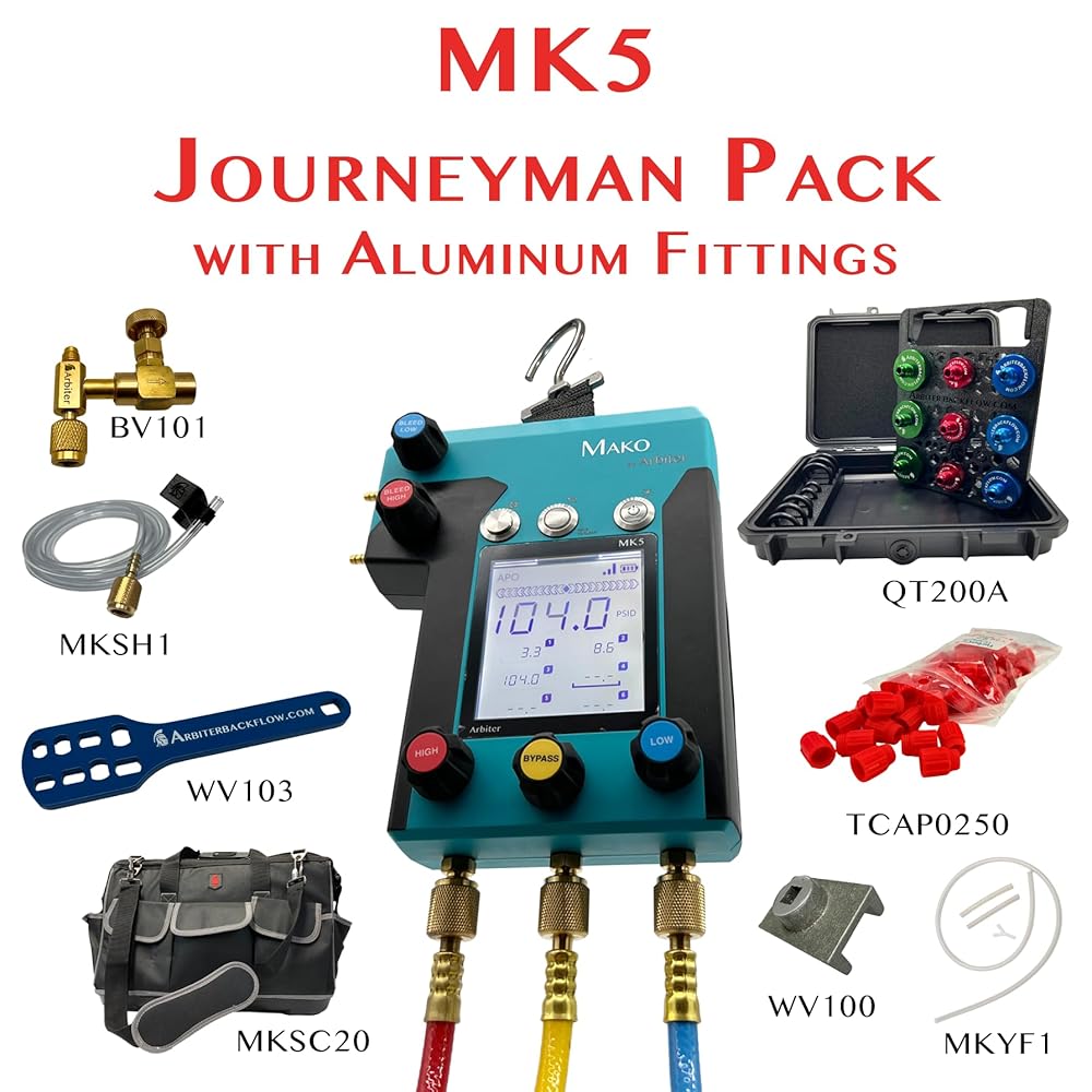 Everything you need to get established as a top-tier backflow tester in one convenient bundle, the Mako MK5 Journeyman Pack. This version has a full set of 9 aluminum quick test fittings with holder to save on weight. Journeyman Pack contains the 5-valve Mako backflow test gauge, set of 3 backflow test hoses, Y-fitting kit to simplify the bleed port flow, the Mako sight hose kit to simplify testing on double check valve assemblies, the best bleed-off valve to compensate for leaking #1 shutoff valves in testing, the 1/4" TurboCaps to protect the test ports after you test, the smaller missing handle ball valve wrench, the smaller stuck handle ball valve wrench, and the 20-inch tester tool bag with hard plastic bottom to transport all your tools with ease and style. Get out there and test!