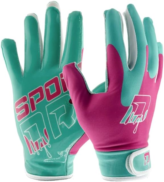 Elevate your game with these youth football receiver gloves designed for young athletes who demand both performance and style. The ultra-sticky grip palm technology ensures confident catches in any weather, while the breathable mesh backhand keeps hands cool during intense gameplay. These gloves feature a youth-specific fit with precise hand measurements ranging from 7.25" to 9" circumference across sizes, delivering optimal control for developing players. The signature teal and pink design adds a bold statement to your on-field look. A snug, adjustable cuff provides essential wrist support without limiting mobility, making these gloves perfect for everything from practice drills to game-winning catches. Built with durability in mind, these gloves are ready to withstand the rigors of every play, catch, and touchdown celebration. Whether you're running routes or making highlight-reel grabs, these receiver gloves deliver the perfect combination of grip, comfort, and style for rising football stars.