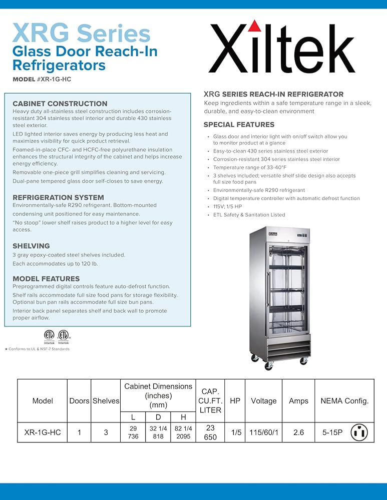 Commercial Grade: Professional-quality 23 cubic feet reach-in refrigerator featuring stainless steel construction and glass door for commercial kitchen and retail display applications