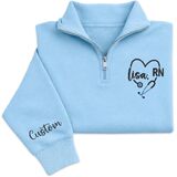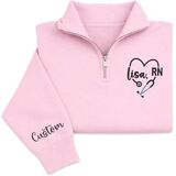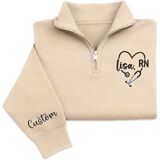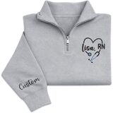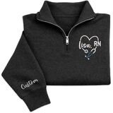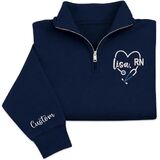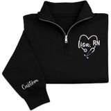 Celebrate your dedication to healthcare with this personalized nurse quarter zip sweatshirt featuring a beautifully embroidered stethoscope heart design and RN lettering. Designed for comfort and style, this pullover allows you to customize the name on the chest as well as optional text on the sleeve, creating a meaningful piece of nurse apparel that reflects your professional pride.