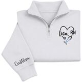 CUSTOM EMBROIDERED NURSE DESIGN - Stylish quarter zip sweatshirt featuring a beautifully embroidered stethoscope heart with RN text. Personalize it with your name for a unique nurse apparel piece that celebrates dedication and compassion in healthcare.