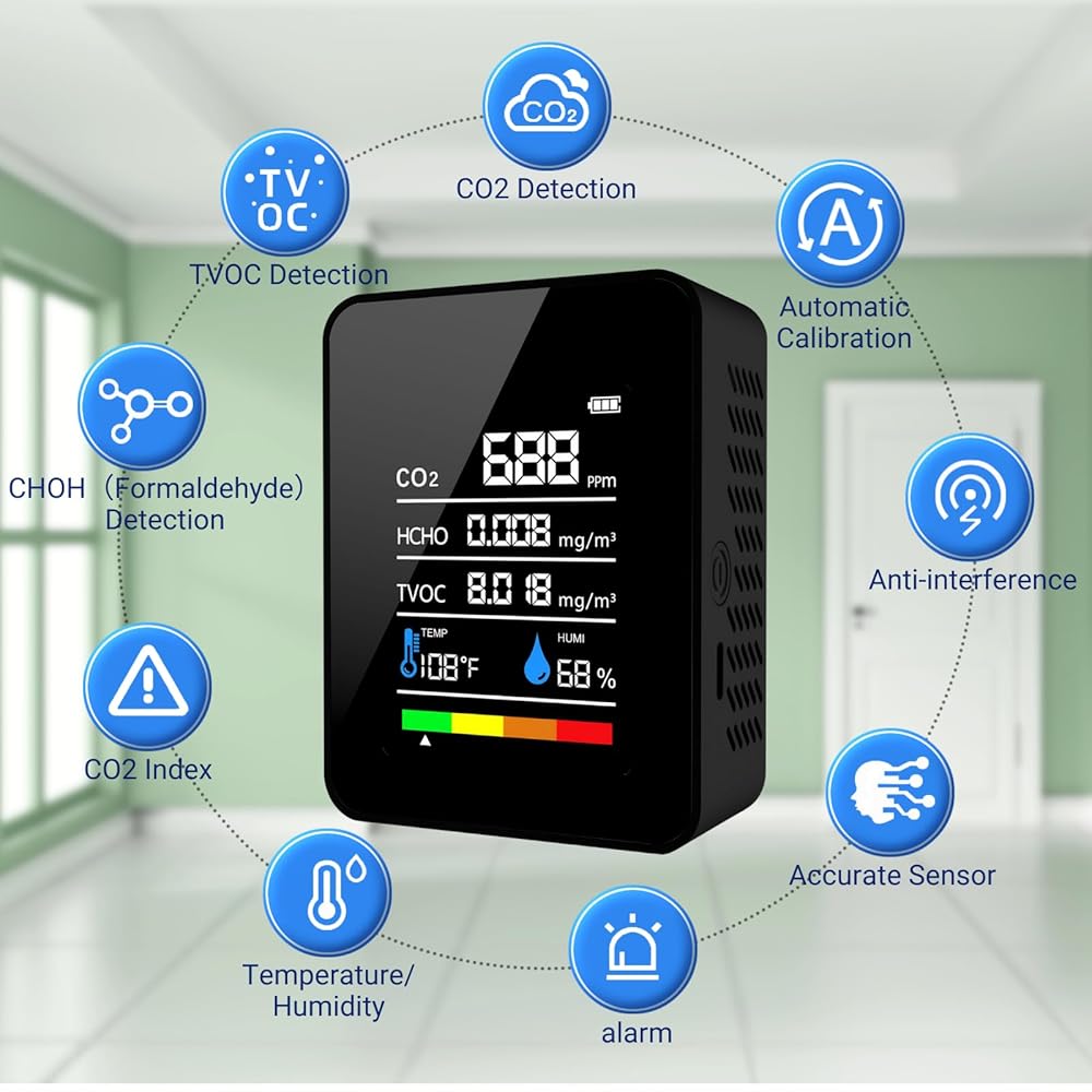 Keep your family safe with this 5-in-1 indoor air quality monitor, designed to detect CO2, formaldehyde (HCHO), TVOC, temperature, and humidity in real time. Whether you're concerned about poor ventilation, harmful gases, or indoor pollution, this compact device delivers quick and reliable readings to help you breathe easier. The 2.8" color screen with clear icons makes it easy to understand air quality at a glance, while the built-in rechargeable battery ensures you can use it anywhere—from your home, office, classroom, nursery, to travel accommodations. Unlike basic detectors, this model uses high-precision sensors for more accurate and trustworthy monitoring.
