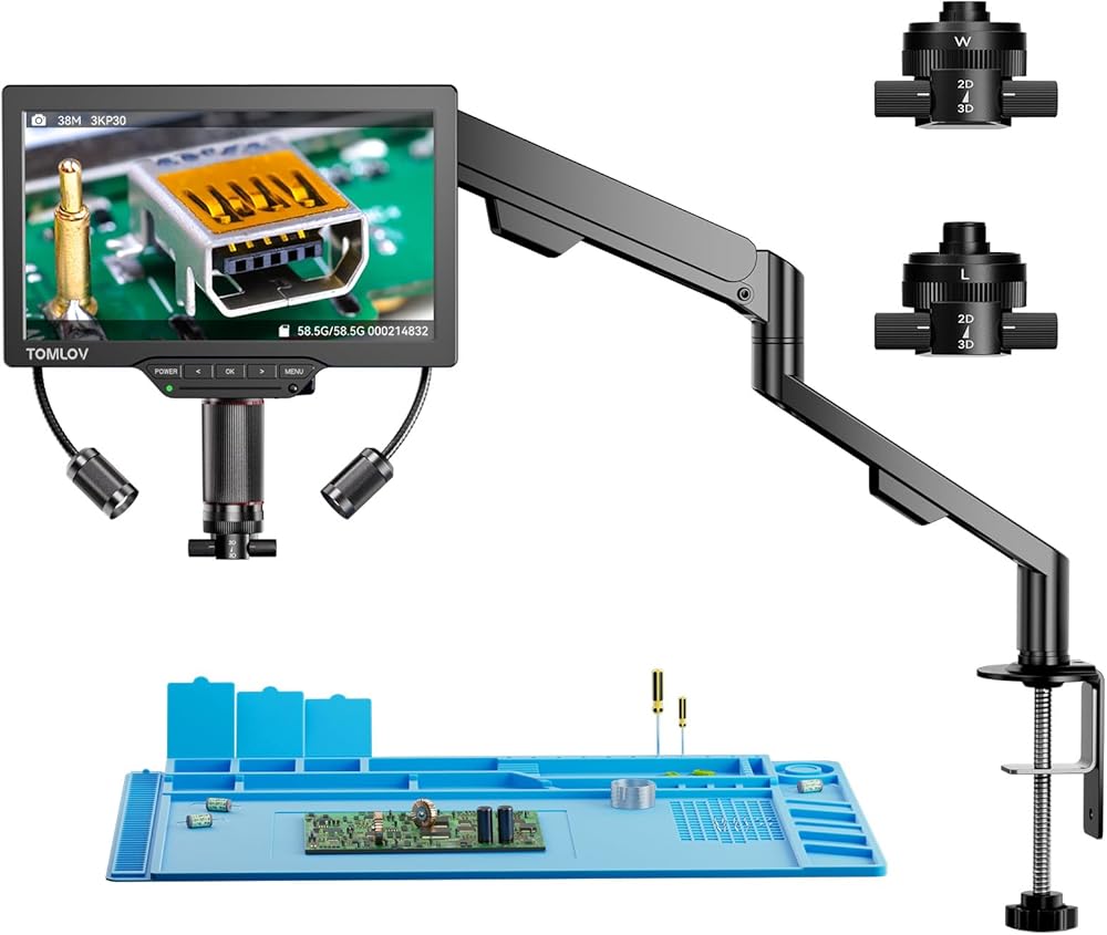 TOMLOV 3D Digital Microscope for Soldering: Magnetic Dual Lens Micro Scope TM3K-3D for Adult, Coin Microscope with Flex Arm, 3K 7-Inch IPS Screen, HDMI/USB Output, Gooseneck Light, Repair Mat, 64GB