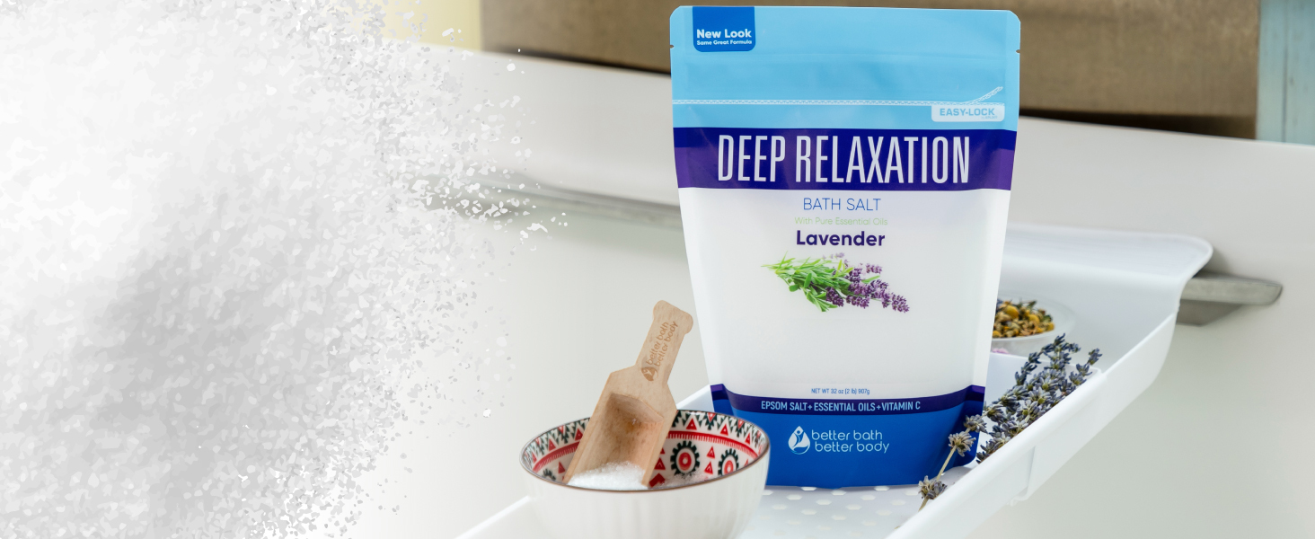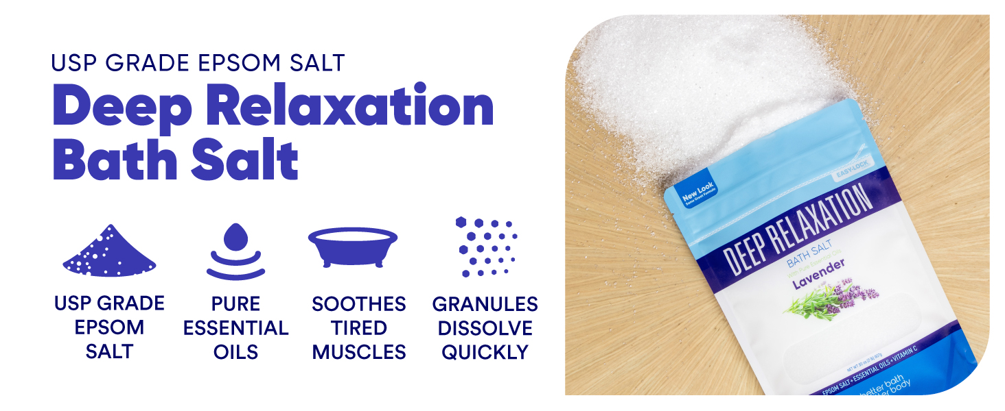 Deep Relaxation Bath Salt 32 Ounces Epsom Salt with Natural Lavender Essential Oil Plus Vitamin C in BPA Free Pouch with Easy Press-Lock Seal